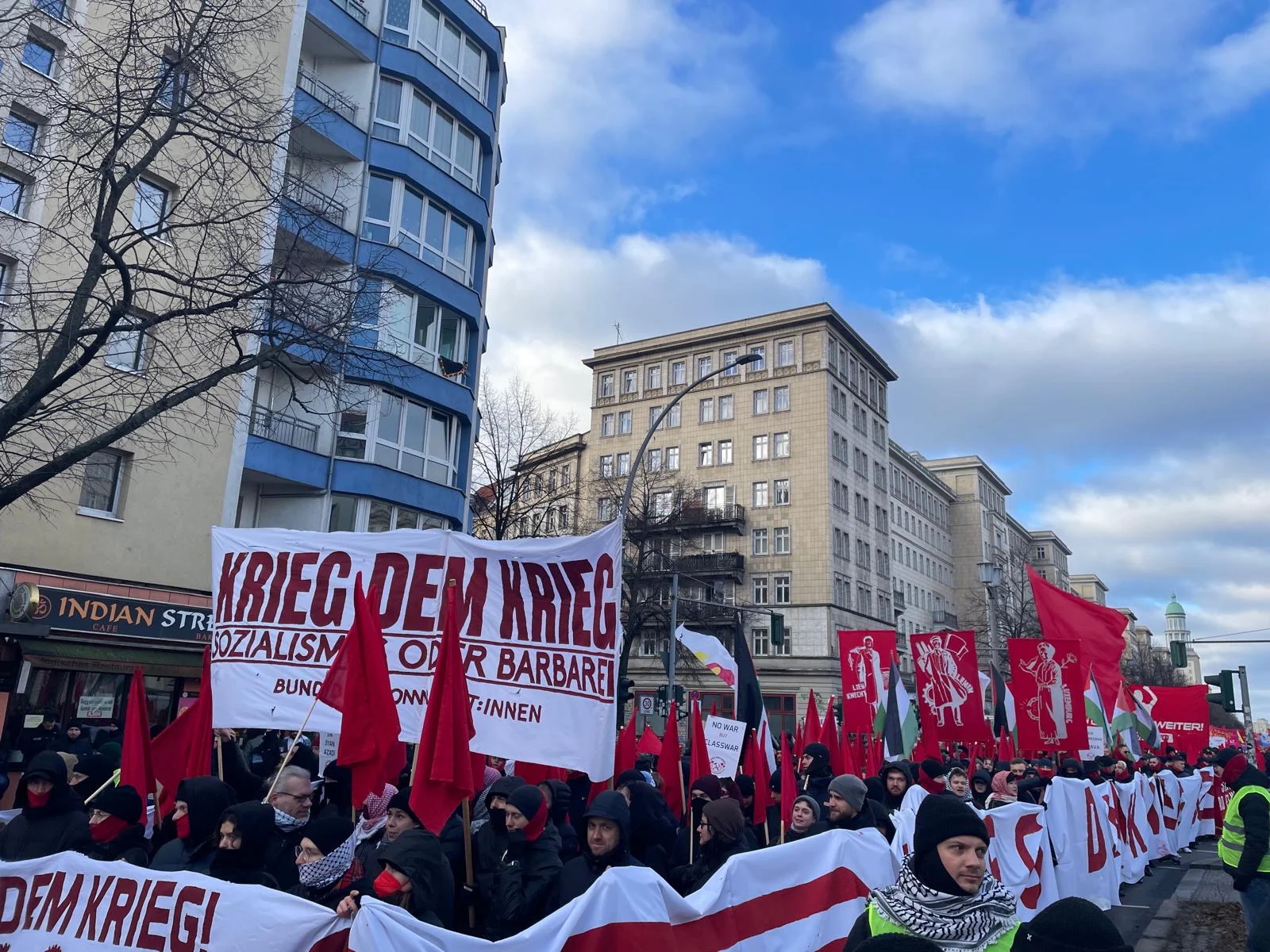 Her yıl Ocak ayının 2. haftasında düzenlenen Lenin, Liebknecht, Luxemburg (LLL) yürüyüşüne katılmak için Almanya ve Avrupa’nın bir çok kentinden gelen binler Frankfurter Tor’da toplandı. Soğuk hava koşullarına rağmen binler yürüyüş düzenledi. Son yıllarda “LLL” yürüyüşüne katılan devrimcilerin oluşturduğu kortejlere saldırı bu yıl da devam etti. Yürüyüşte yer alan Filistin ulusuyla ve Filistin direnişiyle dayanışma gösteren örgüt ve kortejlere, Filistin bayrağı taşıyanlara, Alman emperyalist devletini teşhir eden konuşmaların içeriğine ve taşınan pankartlara karşı Alman polisi saldırı talimatı verdi. Yapılan konuşmalar esnasında Alman polisi sık sık flama ve pankartlara saldırdı.