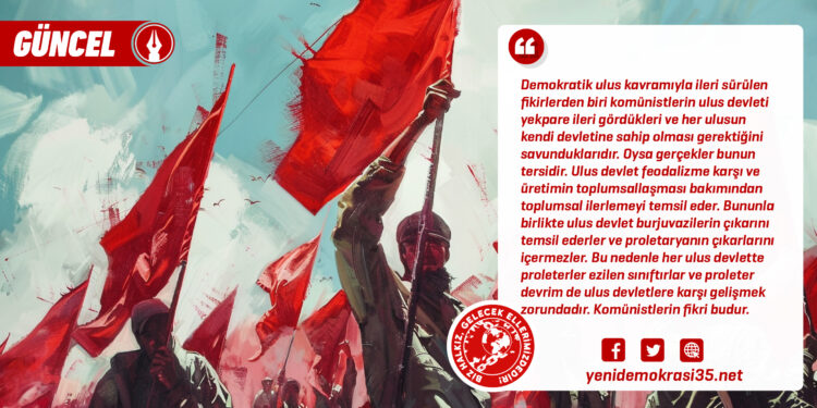 Demokratik ulus kavramıyla ileri sürülen fikirlerden biri komünistlerin ulus devleti yekpare ileri gördükleri ve her ulusun kendi devletine sahip olması gerektiğini savunduklarıdır. Oysa gerçekler bunun tersidir. Ulus devlet feodalizme karşı ve üretimin toplumsallaşması bakımından toplumsal ilerlemeyi temsil eder. Bununla birlikte ulus devlet burjuvazilerin çıkarını temsil ederler ve proletaryanın çıkarlarını içermezler. Bu nedenle her ulus devlette proleterler ezilen sınıftırlar ve proleter devrim de ulus devletlere karşı gelişmek zorundadır. Komünistlerin fikri budur. Onlar için hiçbir şey “salt ilerici” değildir. Her siyasî oluşum içine doğduğu dünyaya göre geçmişe karşı ilerici, geleceğe karşı gericidir. Feodalizmin çürümüş, yozlaşmış, kitleleri boğan doğasına karşı kapitalizm ve kapitalizmle tam uyumlu ulus devlet ilericidir. Marks ve Engels de ulus devleti bu yaklaşımla olumlamış ve desteklemişlerdir. Ne var ki onlar aynı zamanda proletaryanın tam da bu devletlerle çatışacağını, bu devletleri parçalamak zorunda olduklarını, kurtuluşlarının tek yolunun da bu olacağını savunmuşlardır.