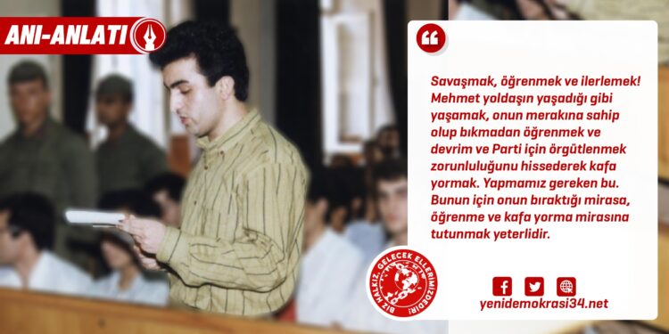 Savaşmak, öğrenmek ve ilerlemek! Mehmet yoldaşın yaşadığı gibi yaşamak, onun merakına sahip olup bıkmadan öğrenmek ve devrim ve Parti için örgütlenmek zorunluluğunu hissederek kafa yormak. Yapmamız gereken bu. Bunun için onun bıraktığı mirasa, öğrenme ve kafa yorma mirasına tutunmak yeterlidir. Onun meraka dayanan “Savaş, Öğren, İlerle” sloganı bize örgütlenmek için ilham vermeye devam ediyor. Işıklı yolu yolumuzdur…