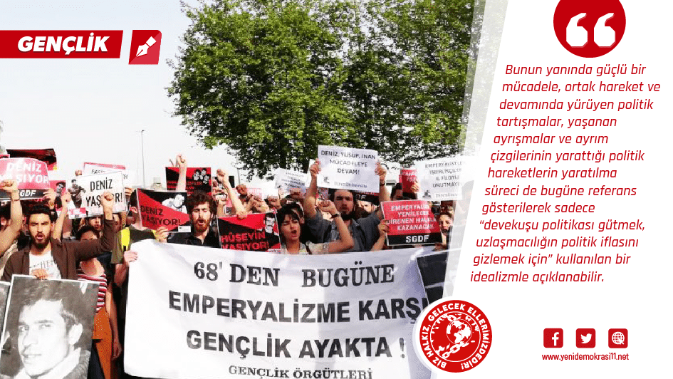 1968’de zirveye ulaşan ve ivme kazanan gençlik hareketi ve 1971’de Mahir ve Deniz önderliğinde silahlı politik önderlikle bir kopuş içine giren, 1972’de ise Kaypakkaya ile birlikte devrimci proleter çizgi ile zirveye ulaşan süreç, bu sürecin ilişki ağları, oluşan örgütlenmeler, dağılan örgütlenmeler ve politik önderliklerin oluşmasına varan gelişmeler bugünün bakış açısıyla adeta tarumar edilmektedir. Çalakalem ajitasyon materyaline çevrilen “tatlı sözlerin tınısı içinde sadece kendini sarhoş eden” bir durum oluşmaktadır. Kaypakkaya’nın Sinanları ihbar eden muhtarı cezalandırması da Mahirlerin Deniz-Hüseyin-Yusuf’u darağacından almaya yönelik eylemleri de birleşik cephenin ya da birlik siyasetinin bir argümanına dönüşmektedir. Devrimci öznelerin şekil alıp, ayrışma noktalarını uzun tartışma ve mücadele yılları içinde belirginleştirip örgüt olarak ortaya çıktığı ve devrimci dayanışma çizgisi üzerinden gerçekleştirdiği pratikler “birleşik mücadelenin” göstergeleri haline getiriliyor. Oysa bu gelenek yani devrimci dayanışma daha sonrasında da devrimci özneler tarafından hayata geçirilmeye çalışılan bir kültürdür. Bu durum ve gerçeklik unutulduğu için ya da geliştirilmediği için “birleşik” mücadelenin ya da kitlelerin örgütlenmesi ve seferber edilmesi sorunu yaşanmadığı açıktır. Bu eksende gençlik örgütleri sorunun nedenini ve çözümünü en baştan yanlış yerde aramaktadır. Kaybettiğin şeyi kaybettiğin yerde aramak, bir dizi kaybın olduğu yerde kuşkusuz arama işi de bir kaosa dönüşmektedir.