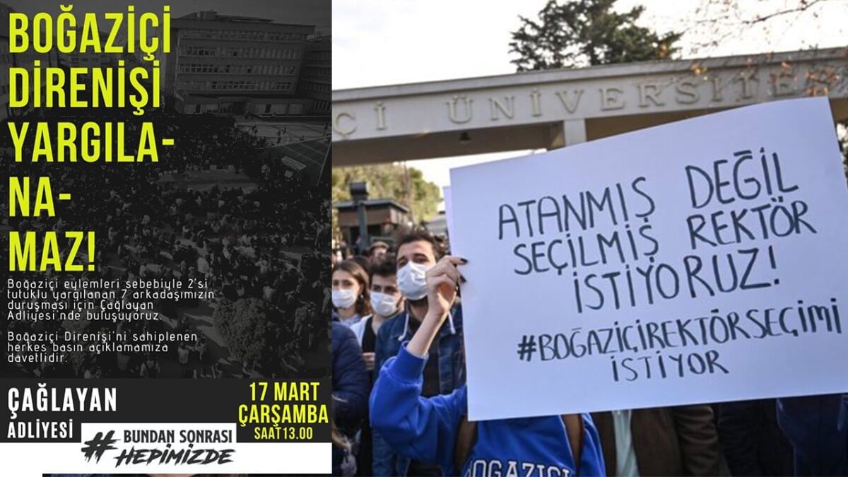 Öte yandan Boğaziçi Dayanışması’nın Twitter hesabından yapılan açıklamada “17 Mart Çarşamba 13:00’te Boğaziçi direnişini savunmak, yargılanan sıra arkadaşlarımızla dayanışmak için Çağlayan Adliyesi’ndeyiz. Tutuklu Boğaziçi direnişçileri serbest kalana, polis-ÖGB ablukası tüm üniversitelerden kalkana dek kesintisiz direnişteyiz!” ifadeleri kullanıldı.