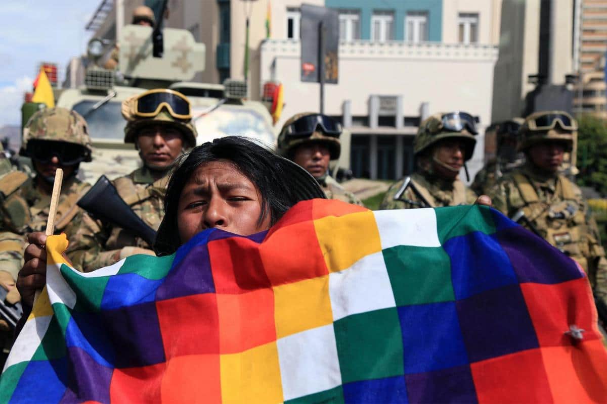 Morales’e destek ve halka dönük saldırıları protesto için yürüyen yerliler Huayllani Köprüsü’nün girişinde polis barikatıyla karşılaştı.