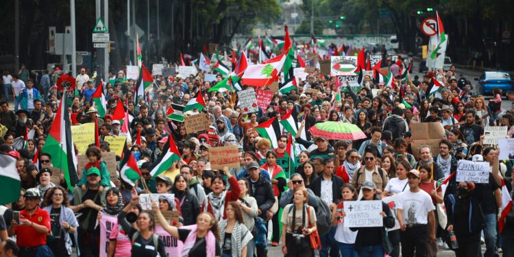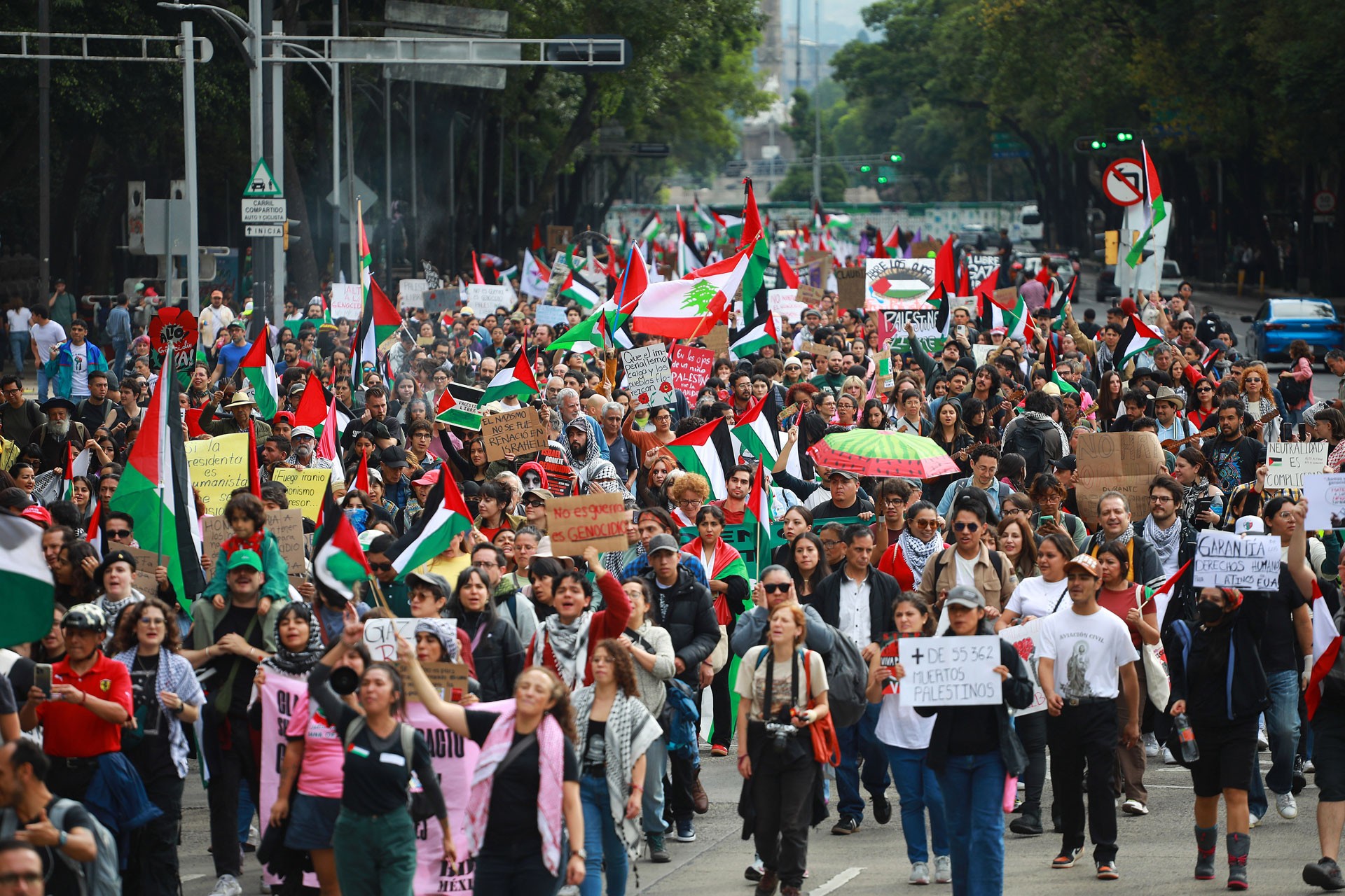 Meksika’nın başkenti Meksiko’da bir araya gelenler, Gazze’de ateşkesin “en hızlı şekilde” ilan edilmesi için eylem yaptı. Kalabalık kitle pankartlarla kent merkezine yürüdü. Grup, yürüyüş boyunca sık sık İsrail karşıtı sloganlar attı.