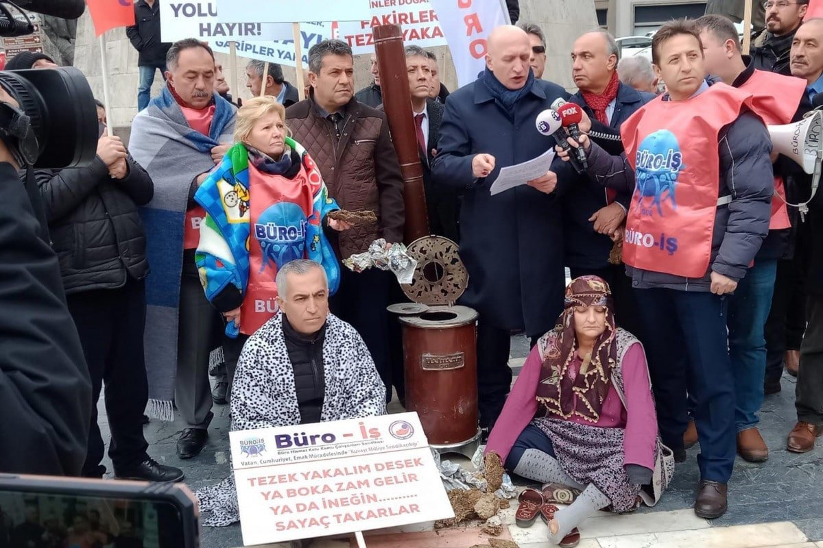 HABER MERKEZİ- Büro-İş Sendikası üyeleri yüksek doğal gaz faturalarını ve Başkent Gaz’ın Kızılay üzerinden vergi kaçırmasını tezek yakarak protesto etti. Büro-İş Sendikası Genel Başkanı Alay Hamzaçebi, “Sanki peteklerin üzerinde kuzu çevirme yapmış gibi yüksek doğal gaz faturaları dar gelirlinin tansiyonunu, kolesterolünü yükseltmekte, emekçileri kaz gibi yolmaktadır” dedi.