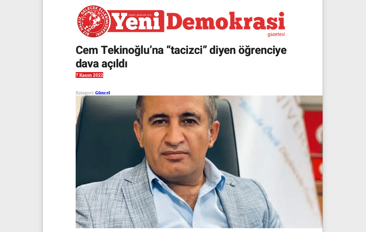 Basın Konseyi’nin göndermiş olduğu şikayet dilekçesinde “YENİDEMOKRASİ.31.NET internet haber sitesinde 7.11.2022 tarihinde yayınlanan “Cem Tekinoğlu’na ‘tacizci’ diyen öğrenciye dava açıldı” başlıklı haberde Basın Meslek İlkeleri’nin ihlal edildiği iddiasıyla şikâyette bulunmuştur.” yer aldı.
