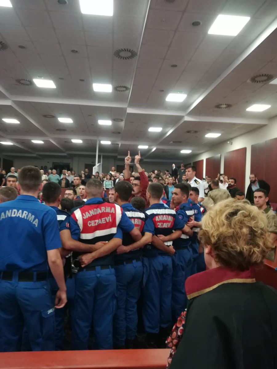 100’e yakın avukatın savunma için hazır bulunduğu duruşma salonunda avukatlar polis yoğunluğuna itiraz etti. Salondaki Terörle mücadele polisleri avukatların ve izleyicilerin tepkisi sonucu alkışlarla protesto edilerek dışarıya çıkarıldı. Duruşma kimlik tespitleriyle başladı.