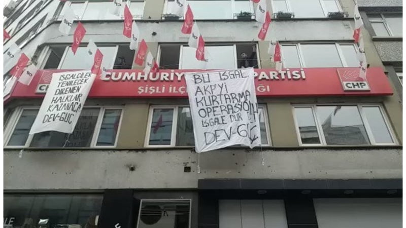 HABER MERKEZİ- Gençliğin Devrimci Güçleri (Dev-Güç) üyeleri Gamze Taşçı, Can Çıldır ile Ali Düzgün, Türkiye’nin Kuzey ve Doğu Suriye’ye yönelik düzenlediği saldırıları protesto etmek amacıyla 16 Ekim’de, tezkereye evet oyu veren Cumhuriyet Halk Partisi (CHP) Şişli İlçe Binasında eylem gerçekleştirdi.