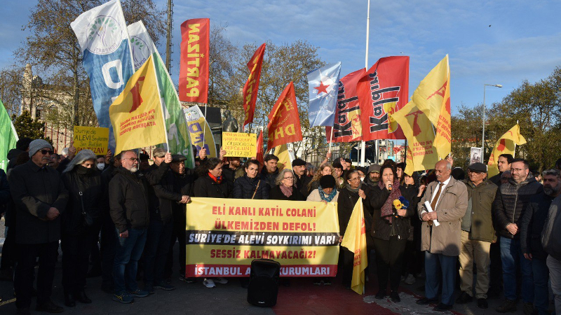 Alevi Bektaşi Federasyonu, Avrupa Alevi Birlikleri Konfederasyonu, Hacı Bektaş Veli Anadolu Kültür Vakfı, Avustralya Alevi Bektaşi Federasyonu, Türkiye Alevi Dernekler Federasyonu, Alevi Kültür Dernekleri, Pir Sultan Abdal Kültür Derneği, Demokratik Alevi Dernekleri, Anadolu Yakası Cem Evleri (Çerağ Bileşenleri) tarafından gerçekleştirilen eylemde ortak açıklamayı İbrahim Karakaya okudu. Suriye’de yönetimin değişmesiyle Aleviler başta olmak üzere farklı inanç ve uluslara dönük sistematik ve geniş çaplı saldırılar gerçekleştiğini, bu saldırılarda binlerce insanın katledildiğini ve on binlerce insanın yerinden edildiğini hatırlatan Karakaya, “Bu ülkenin vicdanlı insanları, bu halkın onurlu evlatları olarak katliamın gölgesinde barış ve kardeşlik mücadelesi veren Alevi halkı olarak bir kez daha haykırıyoruz, mazlumun yanında olacağız bu zulme ortak olmayacağız” dedi.