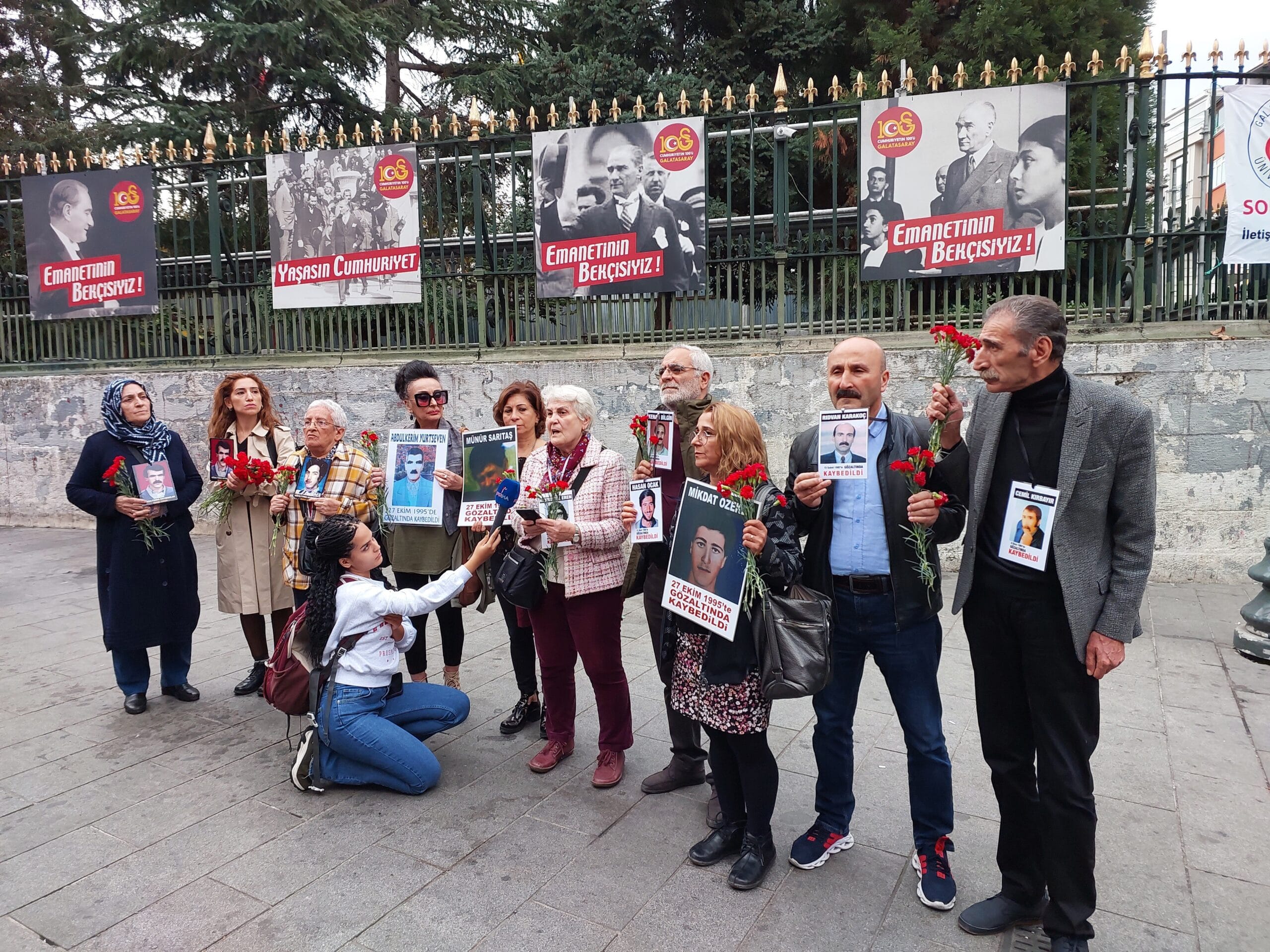 Gözaltında kaybedilen ve katledilen yakınlarının akıbetini sormak ve faillerin yargılanması talebiyle her hafta Galatasaray Meydanı’nda bir araya gelen Cumartesi Anneleri / İnsanları, eylemlerini 972’inci haftasında taleplerini bir kez daha haykırmaya devam ediyor. Anayasa Mahkemesi’nin (AYM) verdiği “ihlal” kararlarına rağmen Cumartesi Anneleri’nin Beyoğlu Kaymakamlığı’nın “yasak” kararı gerekçe gösterilerek engellenmek istense de annelerinin kararlılığı ile Galatasaray Meydanı’nda basın açıklaması gerçekleştirildi.