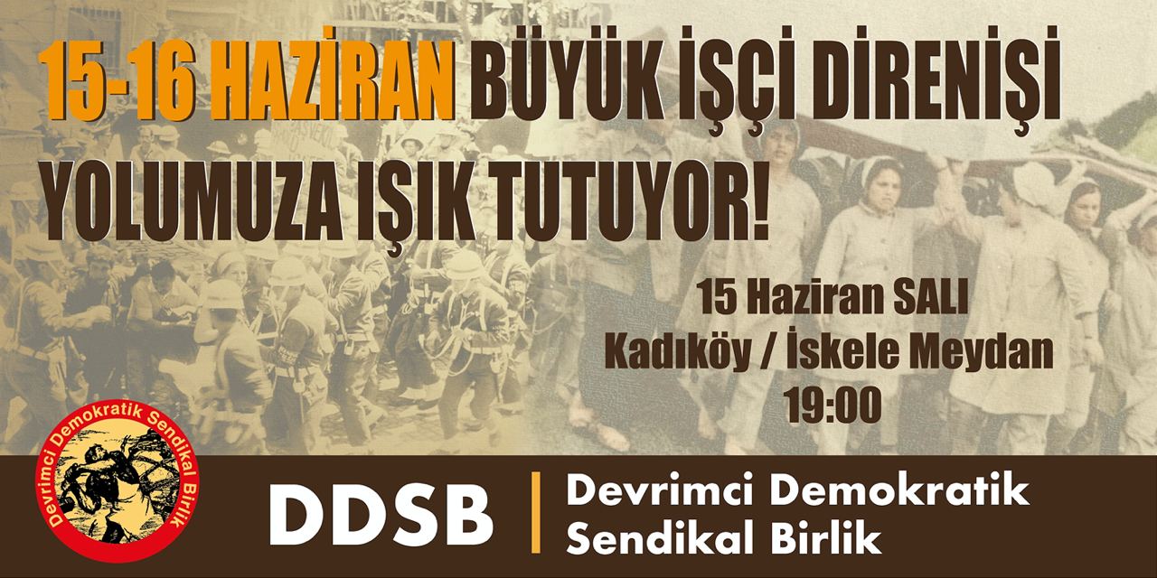 15-16 Haziran Büyük İşçi Direnişi’nin 51. yılında DDSB’nin de içinde yer aldığı 15-16 Haziran Bileşenleri “Hak Verilmez Alınır Zafer Sokakta Kazanılır” şiarıyla bir eylem düzenleyecek. Eylem yarın (15 Haziran-Salı) Kadıköy İskele Meydanı’nda saat 19.00’da gerçekleştirilecek.