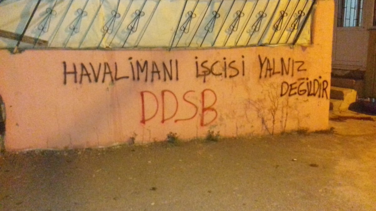“Zafer Direnen Emekçilerin Olacak”, “Havalimanı İşçisi Yalnız Değildir”, “Havalimanı İşçisi Serbest Bırakılsın” şiarlı yazılamar gerçekleştiren DDSB’liler direnişi sahiplenme ve dayanışmayı büyütme çağrısını yinelediler.
