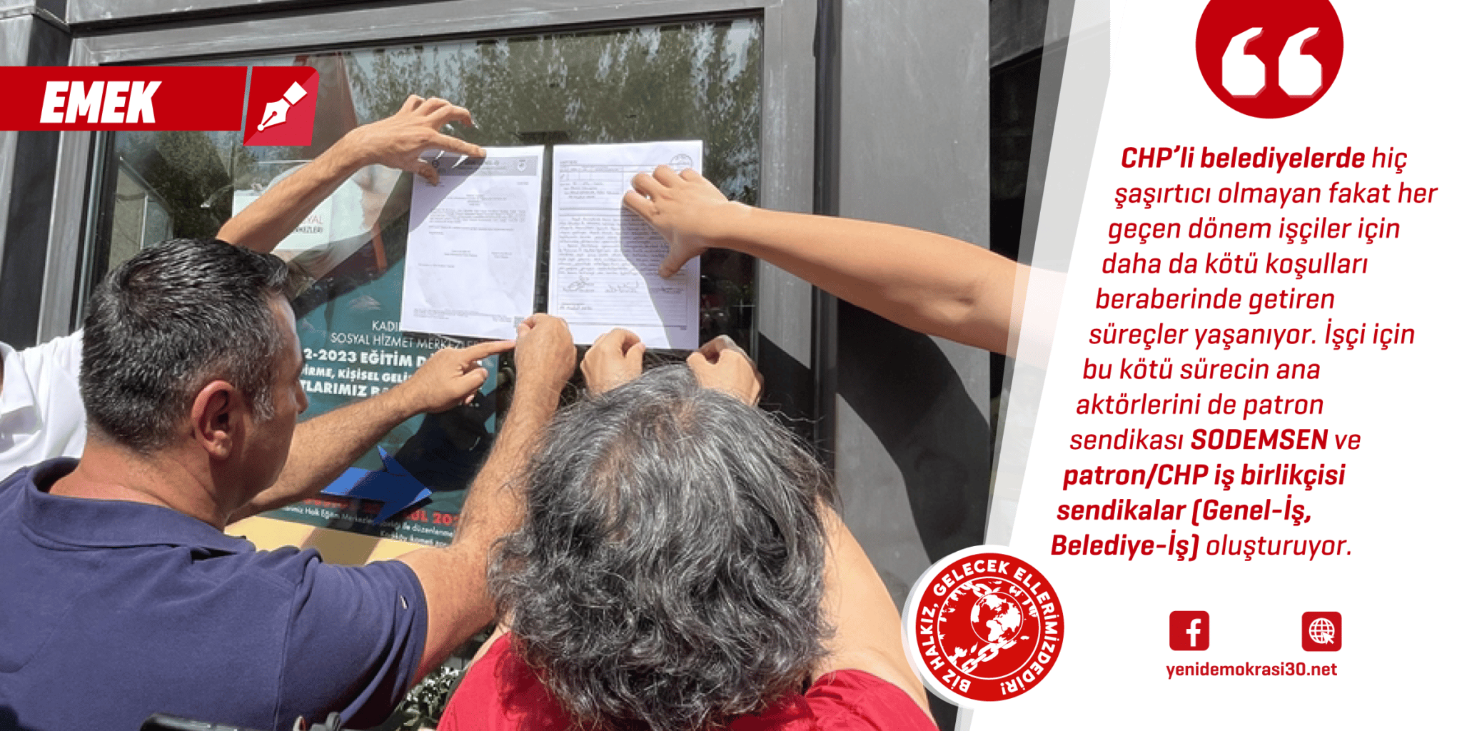 CHP’li belediyelerde hiç şaşırtıcı olmayan fakat her geçen dönem işçiler için daha da kötü koşulları beraberinde getiren süreçler yaşanıyor. İşçi için bu kötü sürecin ana aktörlerini de patron sendikası SODEMSEN ve patron/CHP iş birlikçisi sendikalar (Genel-İş, Belediye-İş) oluşturuyor. Belli belediyelerdeki “klasikler” hiç değişmiyor. İstanbul Anadolu yakasındaki CHP’li belediyeler özgülünde önce Kartal, ardından Ataşehir ve Maltepe belediyelerinde daha sonrasında ise Kadıköy Belediyesinde TİS görüşmeleri sonuçlanıyor ve sıraya uygun olarak hepsinde nicel farklarla benzer sözleşmelere imza atılıyor. SODEMSEN’le yürütülen süreçlerde aylarca tali maddeler üzerinde görüşmeler sürdürülürken ücreti etkileyen ana maddelere bir türlü gelinemiyor. Esas maddelere gelindiğinde ise SODEMSEN en dip rakamlar üzerinden öneriler getiriyor ve görüşmeler tıkanmış oluyor. Artık bilinen bir taktikle SODEMSEN, işçi sendikalarına ölümü gösterip sıtmaya razı ediyor. Sonrasında ise temsilciler, işçiler devre dışı bırakılarak bir gece yarısı “anlaşmaya” varılıyor. Hatta öyle ki sürecin uzaması ve işçilerin ısrarlı talepleri sonucunda belediye yönetimi belli konularda anlaşma eğilimi gösterse bile SODEMSEN buna izin vermiyor ve anlaşmanın önüne geçiyor. Çünkü SODEMSEN, hemen her yerde işçileri açlık ve sefalet rakamlarına “eşitlemek” gibi bir görev üstlenmiş durumda. Bu İstanbul’da, İzmir’de, Ankara’da ve istisnalar hariç diğer tüm CHP’li belediyelerde böyle.