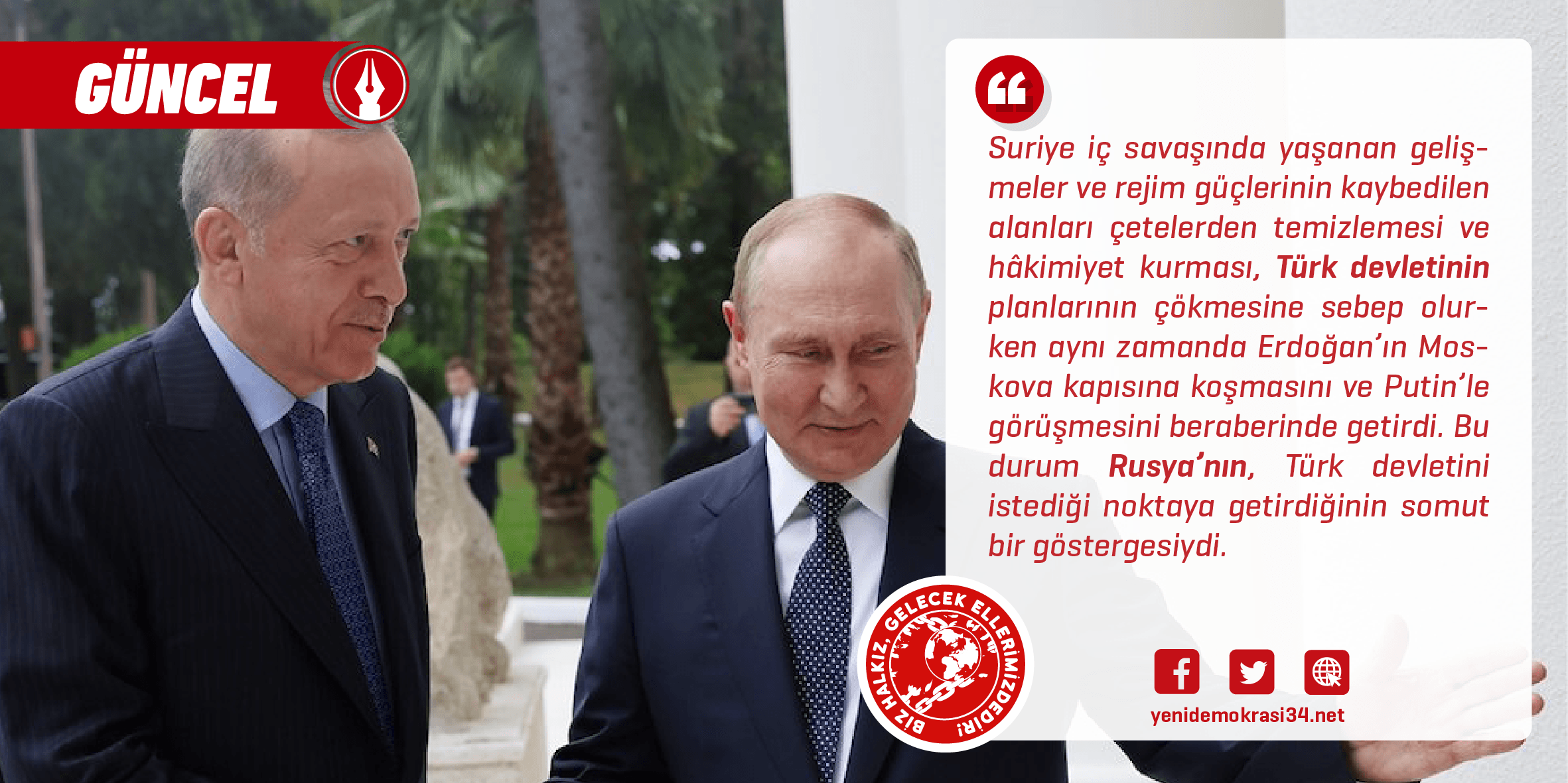 Türk devletinin, Suriye’de cihatçı çetelerin rejimi devirmesi üzerine kurduğu hedefler ve Emevî Camii’nde namaz kılma hayallerinin elinde patlamasının üzerinden yıllar geçti. Rusya’nın ekonomik ve askeri olarak sahada konumlanışı faşist Türk devletinin planlarını suya düşürmesinden itibaren Türk devletinin krizi derinleşmiş durumdadır. Rusya ve rejim güçlerinin ilerleyişi ve cihatçı çetelerin bu alanlardan temizlenmesi Türk devletini yeni arayışlara sokmuştur. Türk devleti için şimdi yeni sonuçsuz hedefler söz konusudur.