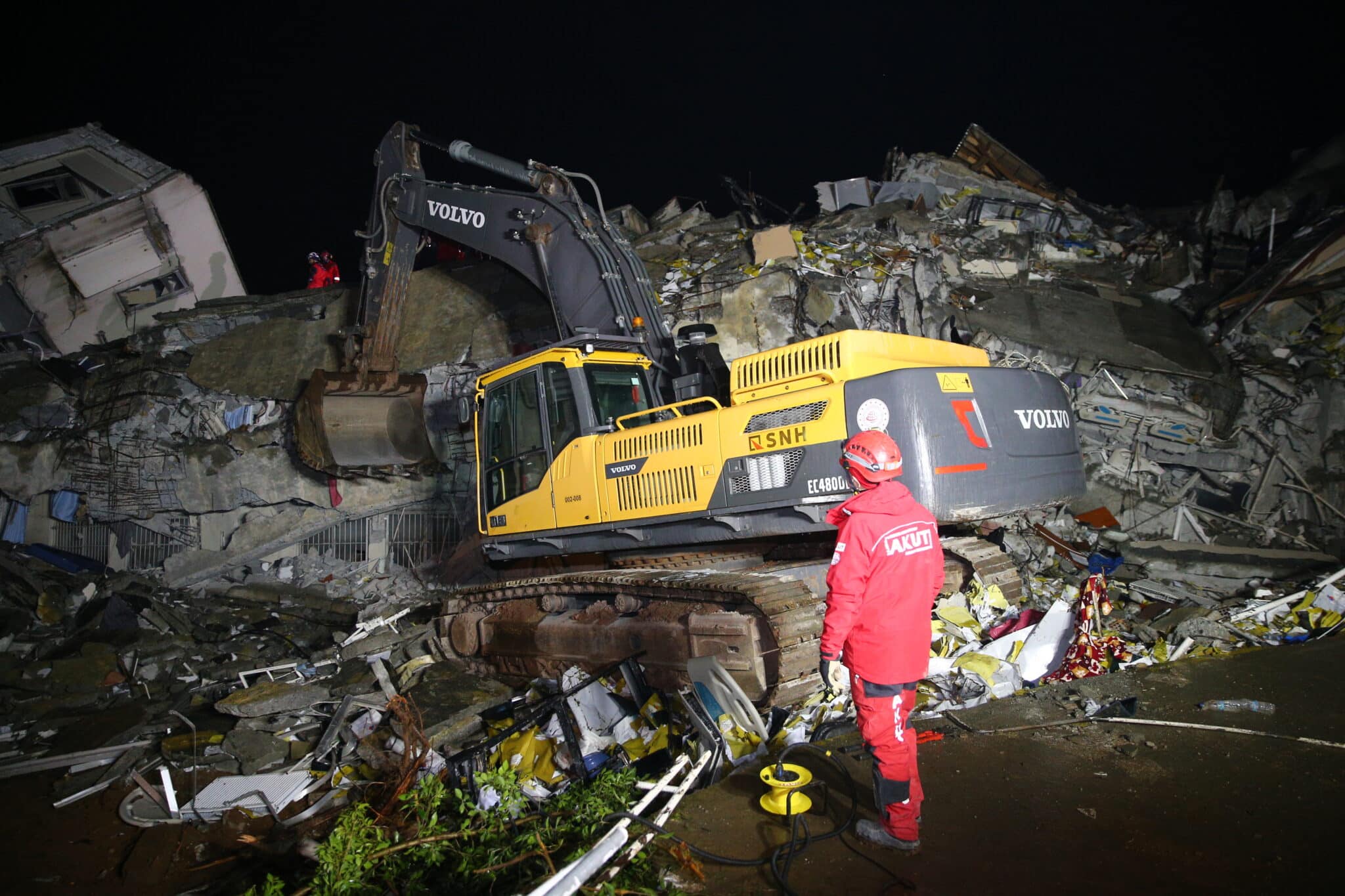 Binanın etrafını aydınlatan ekipler, bazen iş makineleriyle bazen de el birliğiyle enkaz altında kalanlara ulaşmaya çalışıyor.