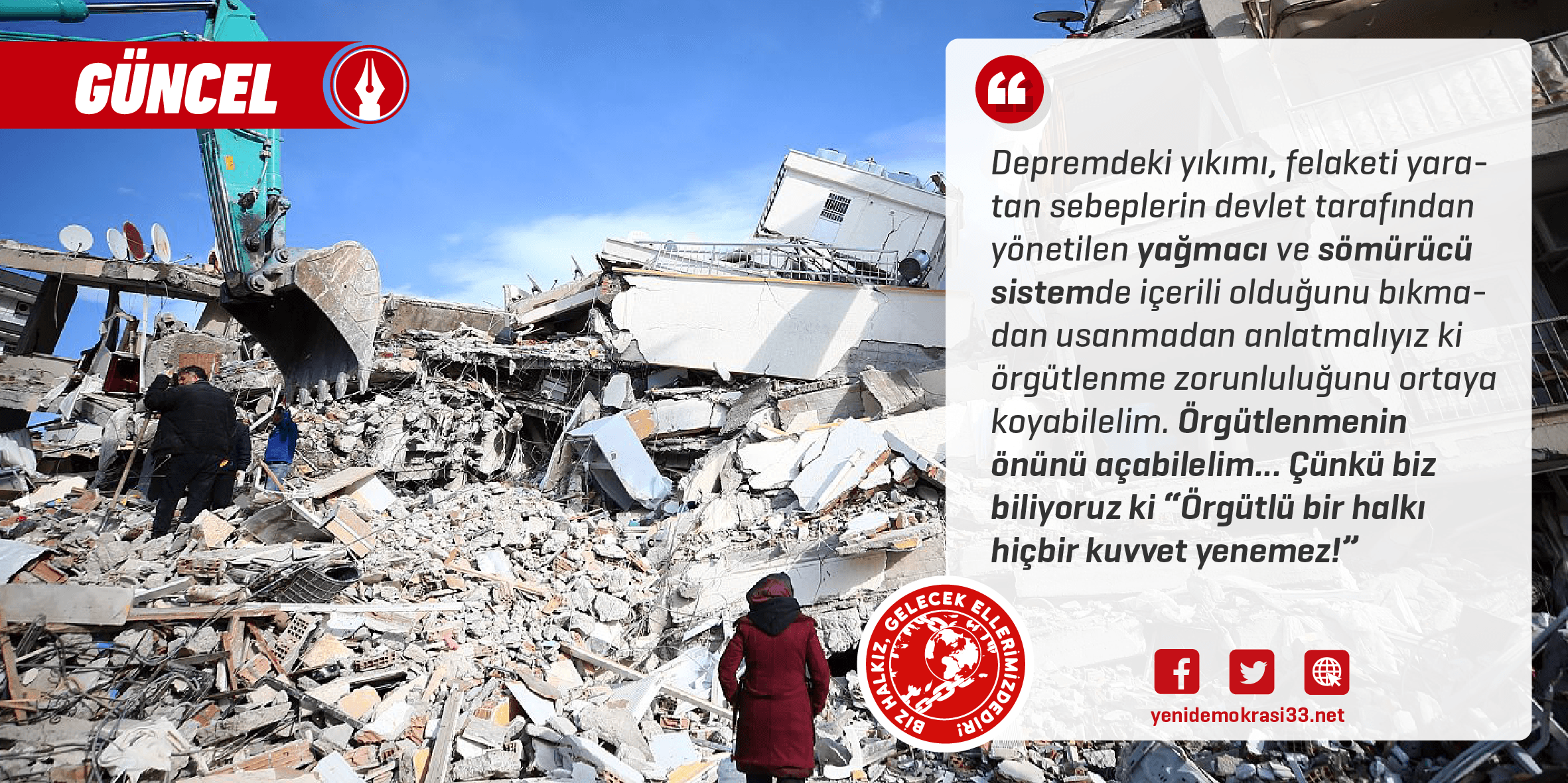 Deprem bölgelerinde çığlıklar yükselmeye devam ediyor. Bıçağın kemiği kestiği bugünlerde kaybedecek hiçbir şeyi kalmayan halkın umut ve direniş nidaları yükseliyor. Emperyalist-kapitalist sistem varlığını sürdürme gayretiyle tutunmaya çalışsa da halkın öfkesi artmaya devam ediyor. Sistem içinde varlığını sürdürmeye çalışan yoksul halk ile karşı karşıya kalan devlet bütün ülkede olduğu gibi deprem bölgelerinde de çekinmeden tüm gücüyle, şiddetle, heybetini sergilemekten çekinmeyerek saldırıyor. Halk da bir arada yürümenin, birlikte ses çıkarmanın yarattığı güvene ve verdiği güce sarılarak bu “heybete” karşı koymaktan artık çekinmiyor.