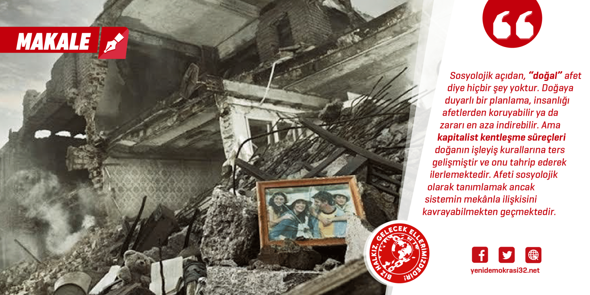 Kısacası sosyolojik açıdan, “doğal” afet diye hiçbir şey yoktur. Doğaya duyarlı bir planlama, insanlığı afetlerden koruyabilir ya da zararı en aza indirebilir. Ama kapitalist kentleşme süreçleri doğanın işleyiş kurallarına ters gelişmiştir ve onu tahrip ederek ilerlemektedir. Afeti sosyolojik olarak tanımlamak ancak sistemin mekânla ilişkisini kavrayabilmekten geçmektedir. Mekân hem somut toplumsal ilişkilerin maddi bir ürünü olarak yükselmekte, hem de bu ilişkilerin baskı ve iktidar süreçleri içinde yansımalarını bulmaktadır. Kapitalist üretimin ihtiyaca göre değil, kâra yönelik güdüsü, özellikle fiziksel, doğal mekânı yok eder ve doğayı değişim değeri yaratmanın basitçe hammaddesi haline getirir. Yıkılan doğa başka bir düzeyde kentlerde “ikinci doğa” olarak yeniden inşa edilir. Bu nedenle kentsel mekânlar doğanın mülk edilmesine bağlı olarak yeni fiziksel ve toplumsal çevreler yaratmak üzere sürekli yeniden üretilmektedir. Bu üretim politik, ekonomik ve toplumsal süreçlerin içerdiği güç ve iktidar ilişkilerinin bir parçası olduğu için, kentsel dokunun k e n d i s i n i d o ğ r u d a n birer çatışma alanı haline getirir. Kentleşme süreçleri açısından ç a t ı ş m a n ı n ana kaynağı şüphesiz, egemen sınıfların, toplumsal ihtiyaçları gözetmeyen kâr amaçlı güdüsünün, emeği ve kentsel mekânı, içerdiği bütün tarihsel miras ve canlı hayatla birlikte piyasada alınıp satılır mallara dönüştürmesinde yatar. Bu nedenle mekânın üretimi “felaketler” yaratma süreci olarak ilerlemektedir.