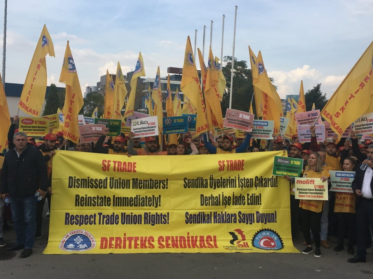 Basın açıklaması öncesinde bir konuşma gerçekleştiren Deriteks Genel Başkanı Musa Servi, SF Trade firması ile dönem dönem karşıya gelmek zorunda kaldıklarını ancak işçilerin temel haklarına saygı duyulmasından başka bir beklenti içinde olmadıklarını, sendikanın anayasal ve yasal bir hak olduğunu ancak birçok iş yerinde işçilerin sendikal haklarını kullandıkları için işten çıkarıldığını ve bunun kabul edilemeyeceğini belirterek diyalog çağrısında bulundu.