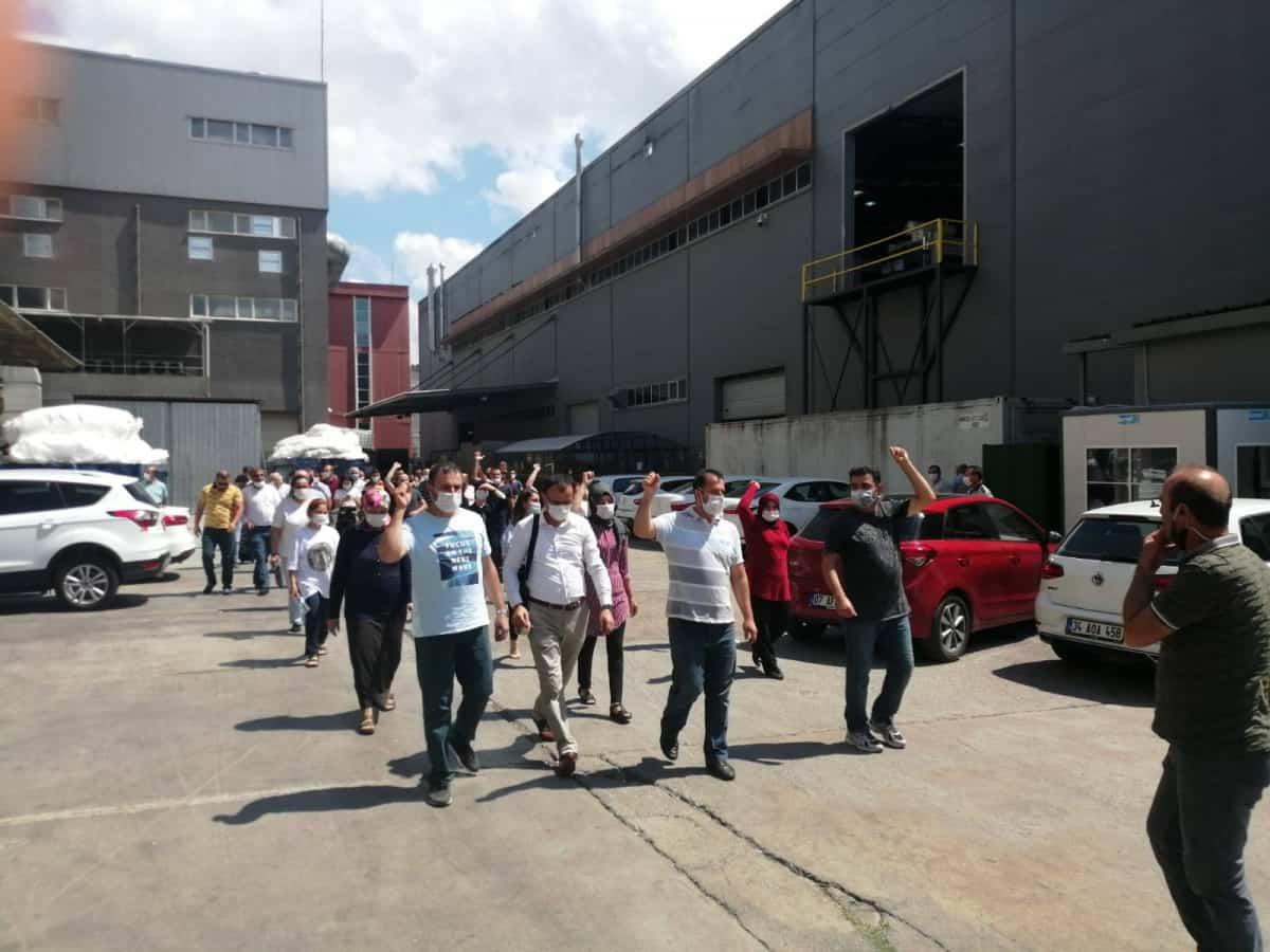 DERİTEKS Genel Yönetim Kurulu Üyesi Binali Tay, 70 üyelerinin bulunduğu fabrikada Mercedes, Volkswagen, Audi gibi markalar için araba koruma kılıfı üretildiğini söyledi. Sözleşme görüşmelerinin 1 Ocak’ta başladığını hatırlatan Tay, “3 görüşme yapıldı, idari maddelerde anlaşma sağlandı. Fabrika iki ortaklı. Ücret maddesine gelince ortaklardan birinin ayrılması ve devir söz konusu oldu. Bu nedenle toplu sözleşmemiz tıkanmaya başladı. Görüşme sürerken pandemi süreci başladı. Sözleşmeler askıya alınınca 3 ay da böyle devam etti” dedi.
