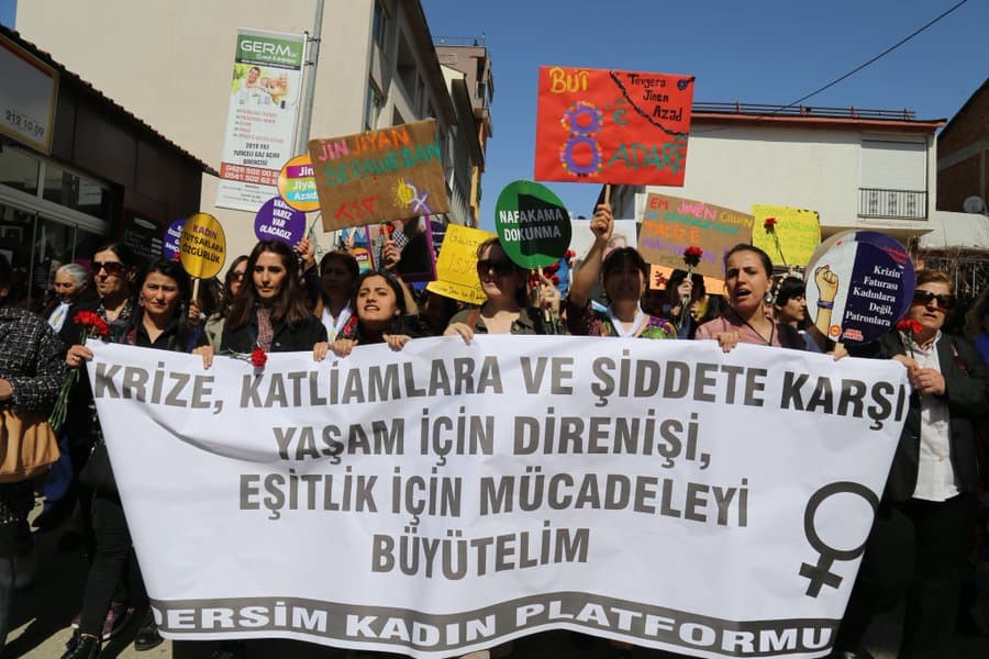 Dersim Kadın Platformu, 8 Mart Dünya Kadınlar Günü kapsamında sanat sokağında yürüyüş düzenledi. Rengarenk kıyafetleri ve talepleriyle Seyit Rıza Meydanı’nda bir araya gelen kadınlar, “Krize, katliamlara ve şiddete karşı yaşam için direnişi, eşitlik için mücadeleyi büyütelim” pankartı arkasında toplandı. “Cinsiyet bedende değil beyanda”, “Fabrikalardan sokaklara zaferi kadınlar getirecek” ve kayıp Munzur Üniversitesi üniversite öğrencisi Gülistan Doku’nun fotoğrafının olduğu “Gülistan Doku nerede” yazılı dövizler taşınırken, “Yaşasın kadın dayanışması”, “Jin jiyan azadî” sloganları atıldı. Şarkılar eşliğinde kısa bir halayın ardından platform adına Çağla Yolaşan basın açıklamasını okudu.