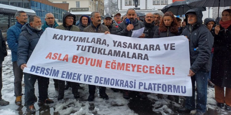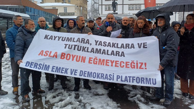 Dersim Emek ve Demokrasi Platformu gözaltı saldırılarına karşı Yeraltı Çarşısı üstünde basın açıklaması yaptı. Açıklamada “Kayyumlara, Yasaklara ve Tutuklamalara Asla Boyun Eğmeyeceğiz” pankartı açıldı. Basın metnini okuyan Ergin Tekin, Van Büyükşehir Belediyesine yönelik kayyım darbesini, protesto eylemlerinde halka uygulanan polis işkencesini, BİRTEK-SEN Genel Başkanı Mehmet Türkmen’in tutsak edilmesini anımsattı.
