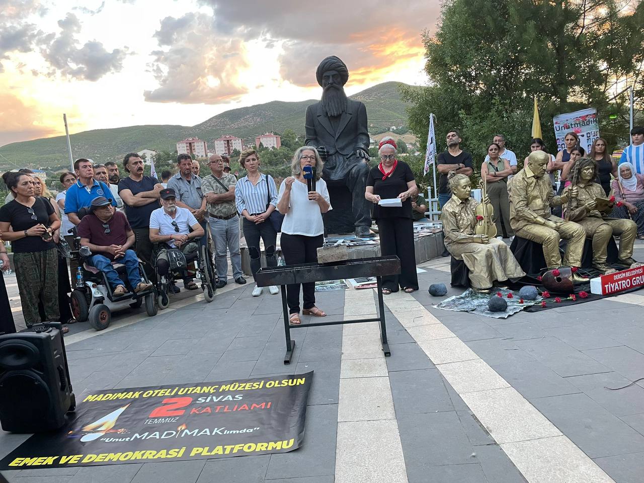 “Ezilen, emekçi halklar olarak mahkeme kararını tanımıyoruz. Herkes bilmelidir ki Madımak Katliamı İnsanlığa karşı işlenmiş zamansız suçlardan biridir ve insanlığa karşı işlenen suçlarda zaman aşımı olamaz. Madımak davasında katilleri savunan avukatlar belediye başkanı, Milletvekili yapılarak ödüllendirilmiştir. Sivas Madımak otelinin utanç müzesi yapılması, Madımak davasının da İnsanlığa Karşı İşlenmiş Suçlar kapsamına alınması talebimiz ise hiç duyulmadı.”