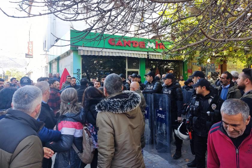 Yere düşenleri kaldırmaya çalışan İsmail Anıl Salan adlı esnaf gözaltına alındı. (Evrensel)
