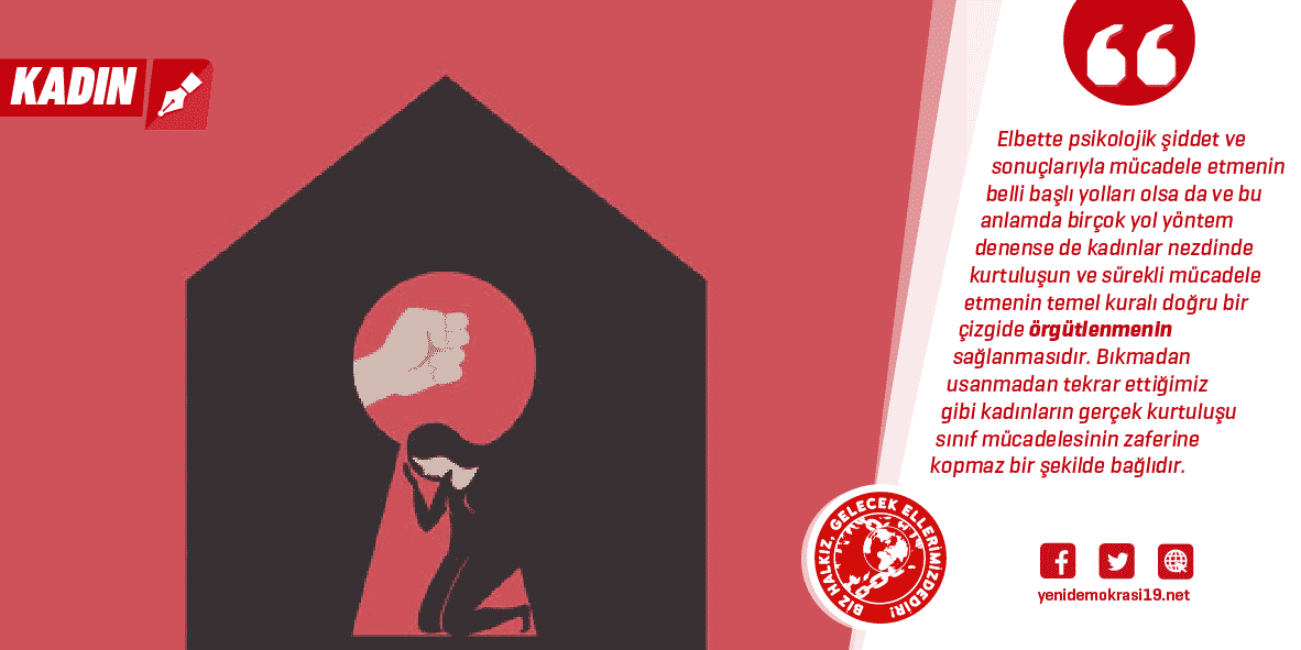 Elbette psikolojik şiddet ve sonuçlarıyla mücadele etmenin belli başlı yolları olsa da ve bu anlamda birçok yol yöntem denense de kadınlar nezdinde kurtuluşun ve sürekli mücadele etmenin temel kuralı doğru bir çizgide örgütlenmenin sağlanmasıdır. Bıkmadan usanmadan tekrar ettiğimiz gibi kadınların gerçek kurtuluşu sınıf mücadelesinin zaferine kopmaz bir şekilde bağlıdır. Çünkü işçi ve emekçi kadınlara yönelen her türlü saldırı ve şiddetin kökeninde sınıflı toplum gerçekliği vardır. Psikolojik şiddetin çok yönlü incelenmesi bizi bu gerçeğe vardırmaktadır. O zaman kadına yönelen her türlü şiddetin özünde yatan sınıf gerçeğini kavrayalım emekçi kadın kitlelerini gerçek kurtuluşlarına götürecek Demokratik Halk Devrimi çizgisinde örgütleyelim.