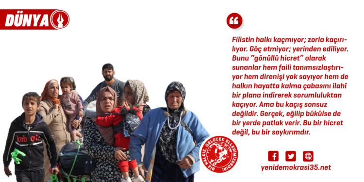 Filistin halkı kaçmıyor; zorla kaçırılıyor. Göç etmiyor; yerinden ediliyor. Bunu “gönüllü hicret” olarak sunanlar hem faili tanımsızlaştırıyor hem direnişi yok sayıyor hem de halkın hayatta kalma çabasını ilahî bir plana indirerek sorumluluktan kaçıyor. Ama bu kaçış sonsuz değildir. Gerçek, eğilip bükülse de bir yerde patlak verir. Bu bir hicret değil, bu bir soykırımdır. Bu ses dünyanın dört bir yanında yankılanmaktadır. Bu, planlı bir etnik temizliğin, emperyalist destekle yürütülen organize bir sürgünün adıdır. Siyonizm’in kurduğu bu ölüm rejimi, insanlığın gözleri önünde bir halkı haritadan silmeye çalışmaktadır. Bu dil, bu kurgulanmış yalan, yalnızca Filistin’i değil, bütün ezilen halkların sesini susturmayı hedeflemektedir. O yüzden, şimdi kelimelerin zincirini kırmak, hakikatin adını doğru koymak ve bu zorbalığa karşı ayağa kalkmak gerekir. Bu, yalnızca Filistin’in değil, dünyanın dört bir yanında emperyalist sömürgeciliğe karşı duran herkesin; ezilenlerin, işçilerin, halkların ortak meselesidir. Hakikat de bir kavga alanıdır. Ve bu kavgada tarafımız Filistin’dir.
