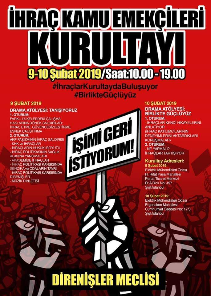 HABER MERKEZİ- 9-10 Şubat tarihlerinde İstanbul’da Direnişler Meclisi tarafından “İhraç Kamu Emekçileri Kurultayı” düzenlenecek. Direnişler Meclisi tarafından bir çağrı yayımlanarak 9-10 Şubat tarihlerinde düzenlenecek olan kurultaya çağrı yapıldı. Kurultayın programı şu şekilde;