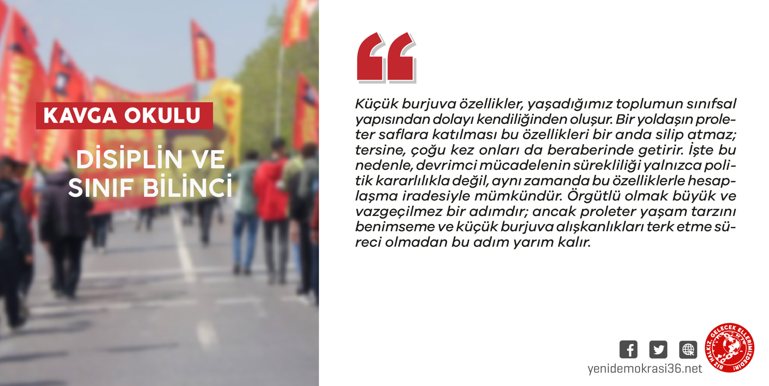 Burada yapmak istediğimiz belirli bir disiplin biçimini kötü ilan etmek değil, iki farklı disiplin anlayışının içerik olarak farklı olduğuna dikkat çekmektir. Proleter sınıf bilinciyle şekillenmiş disiplin kuşkusuz tarihsel olarak üstün bir disiplindir. Ne var ki bu, bireysel disiplin biçimlerinin kötü olduğuna değil, bir kolektif güçten yoksun olduğuna işaret eder… Aralarındaki içerik farkına bu nedenle dikkat çektiğimizi belirtelim…