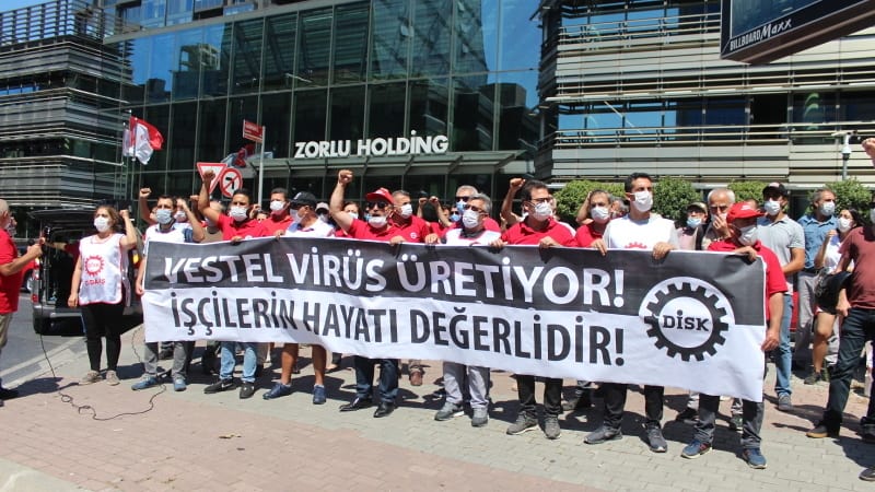 HABER MERKEZİ- DİSK, Manisa’da bulunan sanayi bölgesi ve Vestel fabrikasında çalışan işçiler arasında koronavirüs salgının yayılmasını İstanbul Levent’te bulunan Zorlu Holding binası önünde protesto etti.