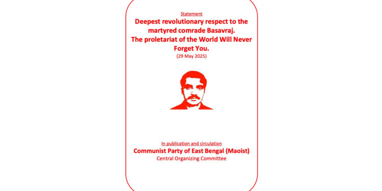 “21 Mayıs 2025’te, yayılmacı Hindistan devleti ve Narendra Modi ile Amit Shah önderliğindeki soykırımcı faşist BJP rejimi tarafından yürütülen bir askerî operasyonda, aralarında Hindistan Komünist Partisi (Maoist) Genel Sekreteri Yoldaş Nambala Keshava Rao (Basavaraj)‘nın da olduğu 27 devrimci şehit düştü. Doğu Bengal Komünist Partisi (Maoist), Yoldaş Basavaraj’ın ve tüm şehitlerin devrimci yaşamlarına derin saygılarını sunar. Aynı zamanda, Hindistan Komünist Partisi (Maoist), Halk Kurtuluş Gerilla Ordusu ile ezilen işçiler, köylüler, Adivasiler, ezilen uluslar ve Hindistan halkının yaşadığı bu büyük kayıptan derin bir üzüntü duyuyoruz. Enternasyonalist sorumluluğumuzun bir parçası olarak, Partimiz Yoldaş Basavaraj ve Hindistan devriminin diğer şehitlerinin aileleriyle, Partisiyle ve yoldaşlarıyla içten dayanışmasını ifade eder.