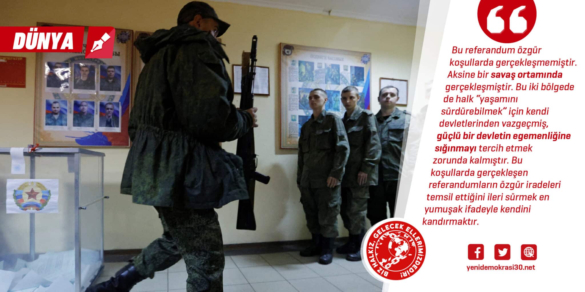 Bu referandumların sonuçlarının ilhak olarak değerlendirilmesi elbette mümkündür. Çünkü Lenin’in dikkat çektiği gibi ilhakı belirleyen şey bir ulus bakımından KKTH’nin çiğnenmesi ve halkın iradesinin yok sayılmasıdır. Donetsk ve Luhansk kurdukları devletlerden vazgeçerek Rusya’ya katıldılar. Bunun bir referandumla gerçekleştiği doğrudur. Fakat bu referandum özgür koşullarda gerçekleşmemiştir. Aksine bir savaş ortamında gerçekleşmiştir. Bu iki bölgede de halk “yaşamını sürdürebilmek” için kendi devletlerinden vazgeçmiş, güçlü bir devletin egemenliğine sığınmayı tercih etmek zorunda kalmıştır. Bu koşullarda gerçekleşen referandumların özgür iradeleri temsil ettiğini ileri sürmek en yumuşak ifadeyle kendini kandırmaktır.