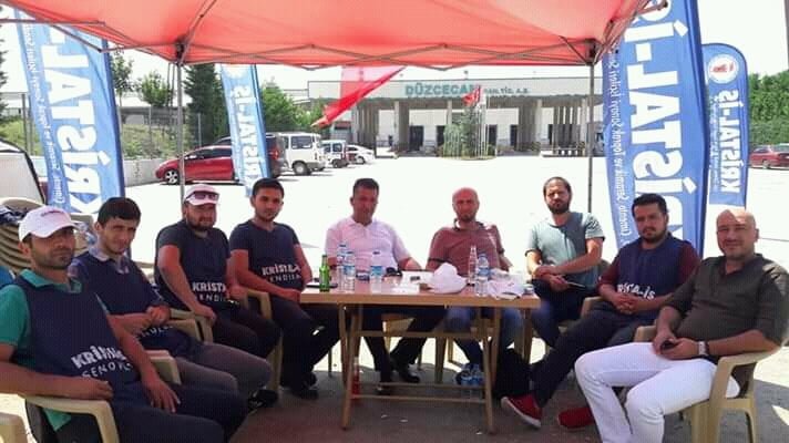 “İşveren yetki tespitine temelsiz gerekçelerle itiraz etti ve dava açtı. Düzce Cam işvereni bu gerekçelerin dayanaksız olduğunun farkındaydı ve davayı kaybedeceğini de biliyordu. Amaç yetkiye itiraz edip sendikalaşmayı yok etmekti. Sendikalaşmaya öncülük yapan işçiler işten atıldı. İşten atma furyası 2016 yılının şubat ayında başladı ve aralıklarla devam etti. İki yıllık hukuk mücadelesinin ardından yetki davasını kazanan taraf sendika oldu. Ancak işveren davayı kaybettikten sonra da sendikayla görüşmeyi kabul etmedi. Devlet tarafından atanan resmi ara bulucuyla bile görüşmedi. Geçtiğimiz birkaç ay içinde Kristal-İş tarafından yasa gereği atanan işyeri temsilcileri ve diğer kimi sendikalı işçiler de işten çıkarıldı. İşten çıkarılan işçilerin sayısı 80’i geçti.