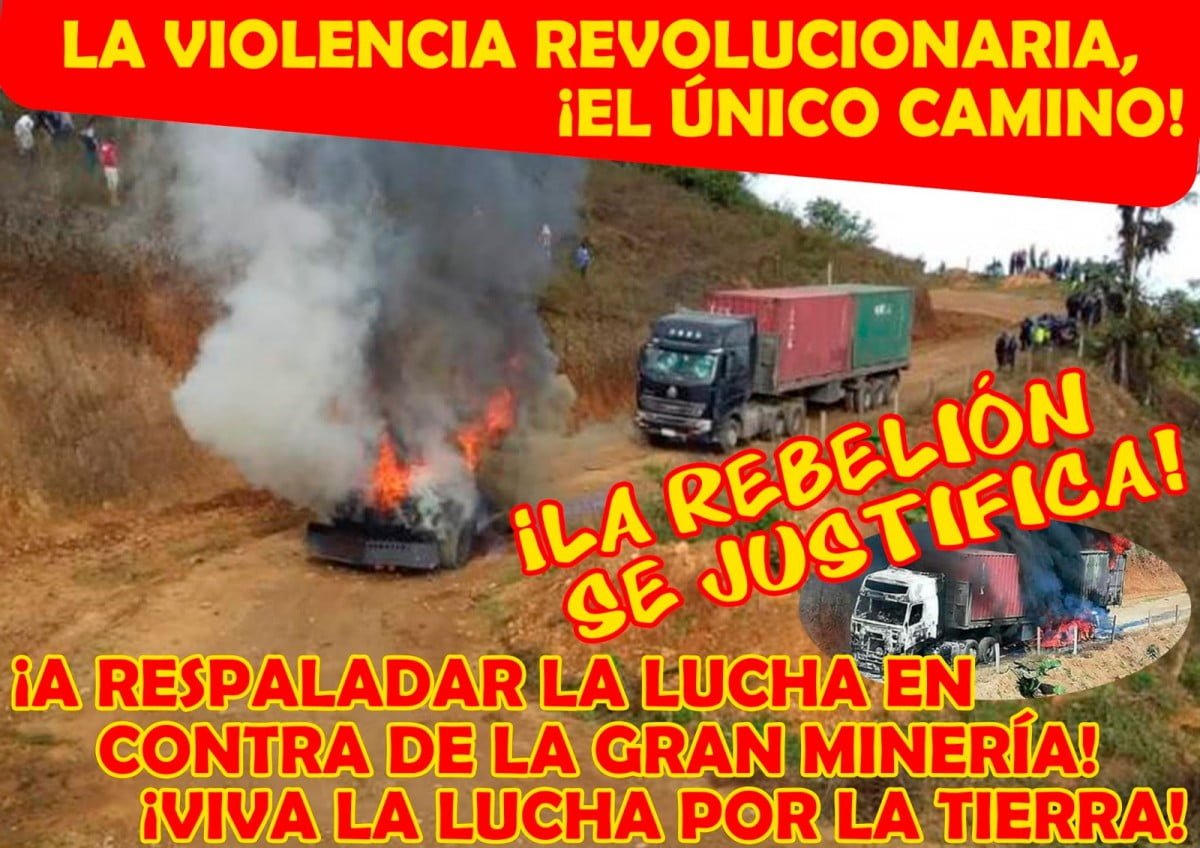 HABER MERKEZİ- Halkın Mücadelesini Savunma Cephesi (FDLP-EC) bu ay başlarında Bolivar bölgesine bağlı Telimbela Parish’te maden çalışması için alana giren Çinli Yankuang Donghua adlı şirkete yönelik bir eylem gerçekleştirdi. Yapılan eylemde molotof kokteylleriyle bir zırhlı polis aracı ve firmaya ait bir traktör yakıldı, 6 polis yaralandı.