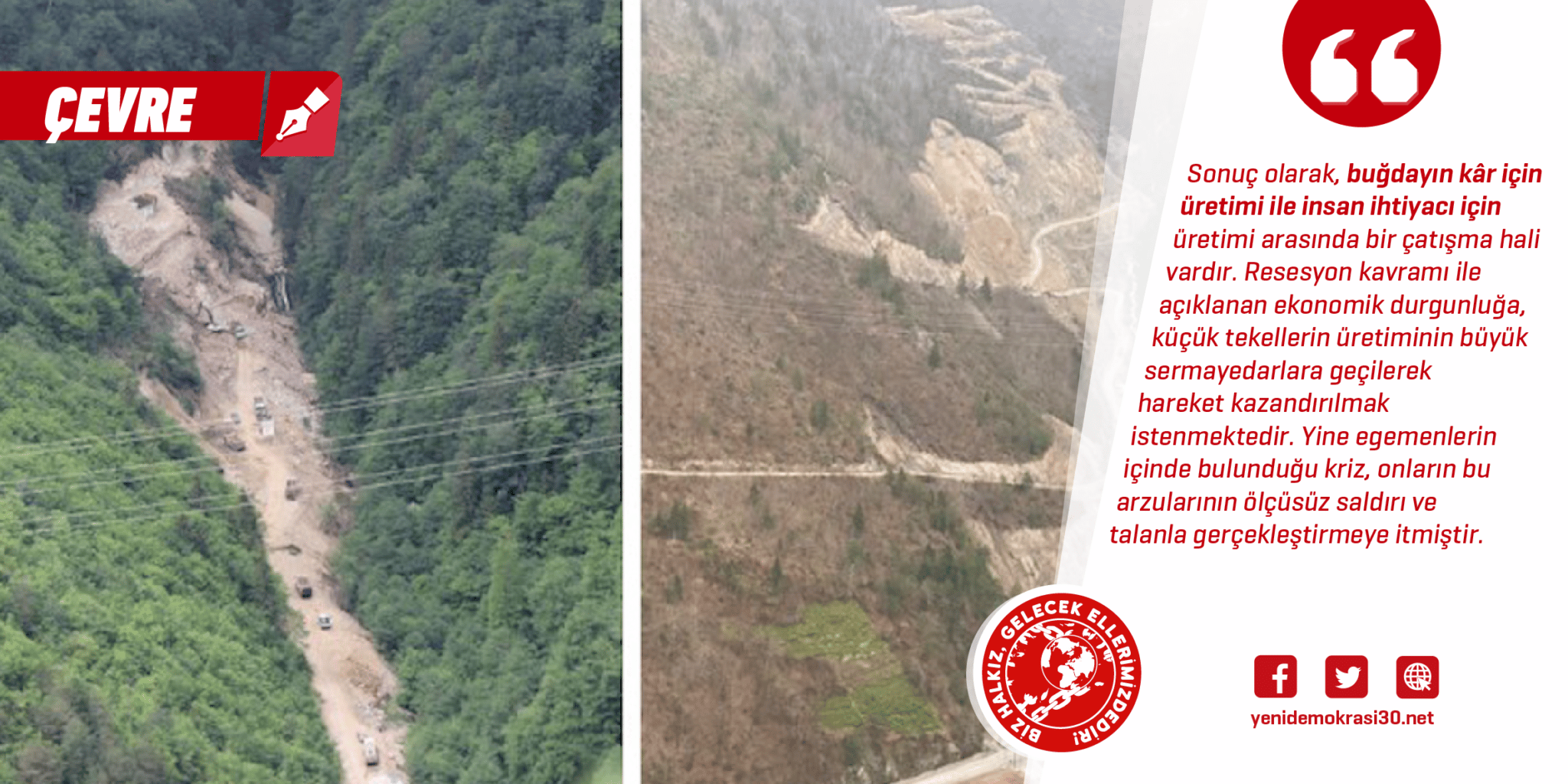 Yarı sömürge, yarı feodal ülkelerde doğanın talan edilmesinin kaynağı ekonomik ve siyasi buhranlardır. Bu anlamda kapitalist pazarın ucuz emek olarak gördüğü ve emperyalist sömürünün rahatlıkla dolaştığı Türkiye’de de topyekûn mücadeleye karşı ‘devlet sopasının’ gösterilmesi, yabancı sermaye ve faşizmin ortaklaşa sömürüsünü doğrulamaktadır. Hâkim sınıfların enerji ihtiyacı gerekçesiyle gerçekleştirdiği doğa sömürüsüne karşı örülecek proleter direniş, yalnızca doğayı zorbaların elinden kurtarmakla kalmayacak, pazar tezgahlarını boş bırakarak kapitalist çürümeyi de görünür kılacaktır.