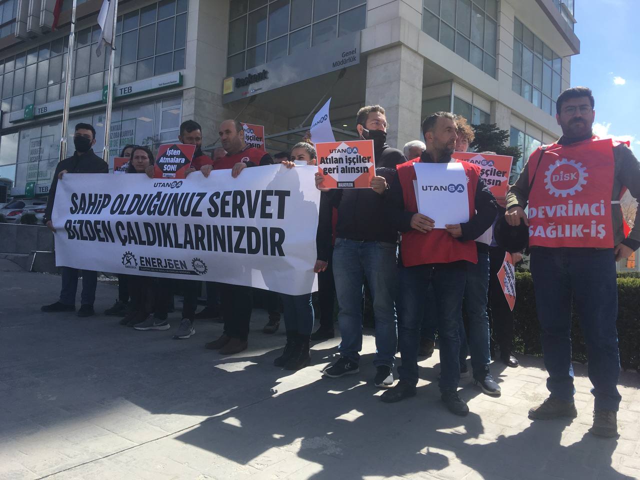 HABER MERKEZİ- EnerjiSA işçileri sendikal tercihlerinden dolayı hukuksuzca işten atılmalarının ardından başlattıkları direnişin dördüncü haftasında Başkent Elektrik Genel Müdürlüğü önünde yaptıkları eylemde İstanbul’a Sabancı’nın ikiz kulelerine gideceklerini açıkladı.