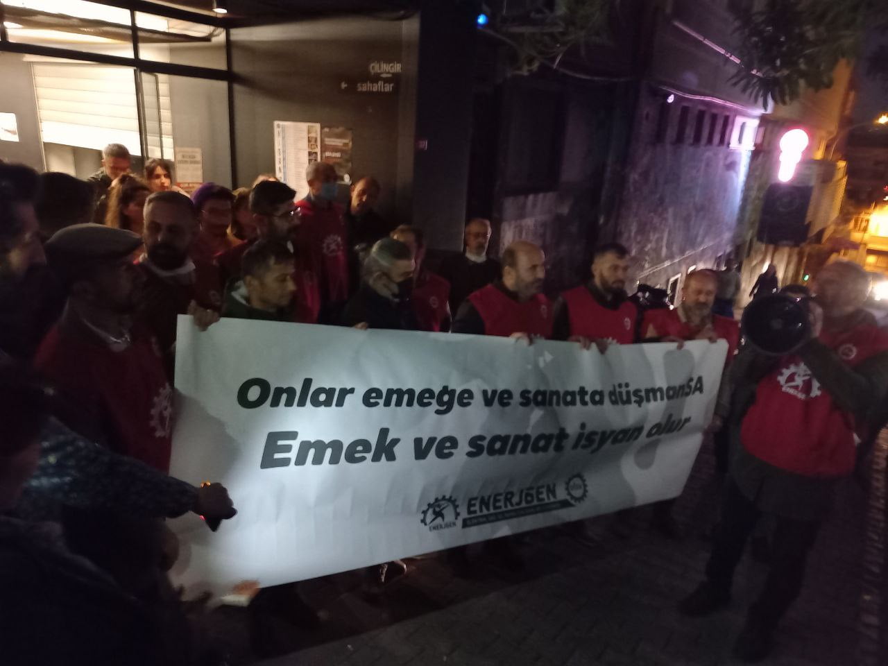 Sendika.Org’un haberine göre; Enerji-Sen Genel Başkanı Süleyman Keskin, şunları söyledi: “Sadece işçinin koşullarını değil abonelerin de koşullarını yaşanılmaz hale getirdiler. Bir sanat kurumunun önündeyiz. Halka sanat ulaştırmakla yükümlü olan tiyatro emekçileriyle aynı patronların farklı saldırılarına maruz kalıyoruz. Bu işin bir ayağı emek elbette. Faturasını ödeyemeyen milyonlarca abone var. Bu işi birlikte bir mücadele hattına çevirmemiz gerek.