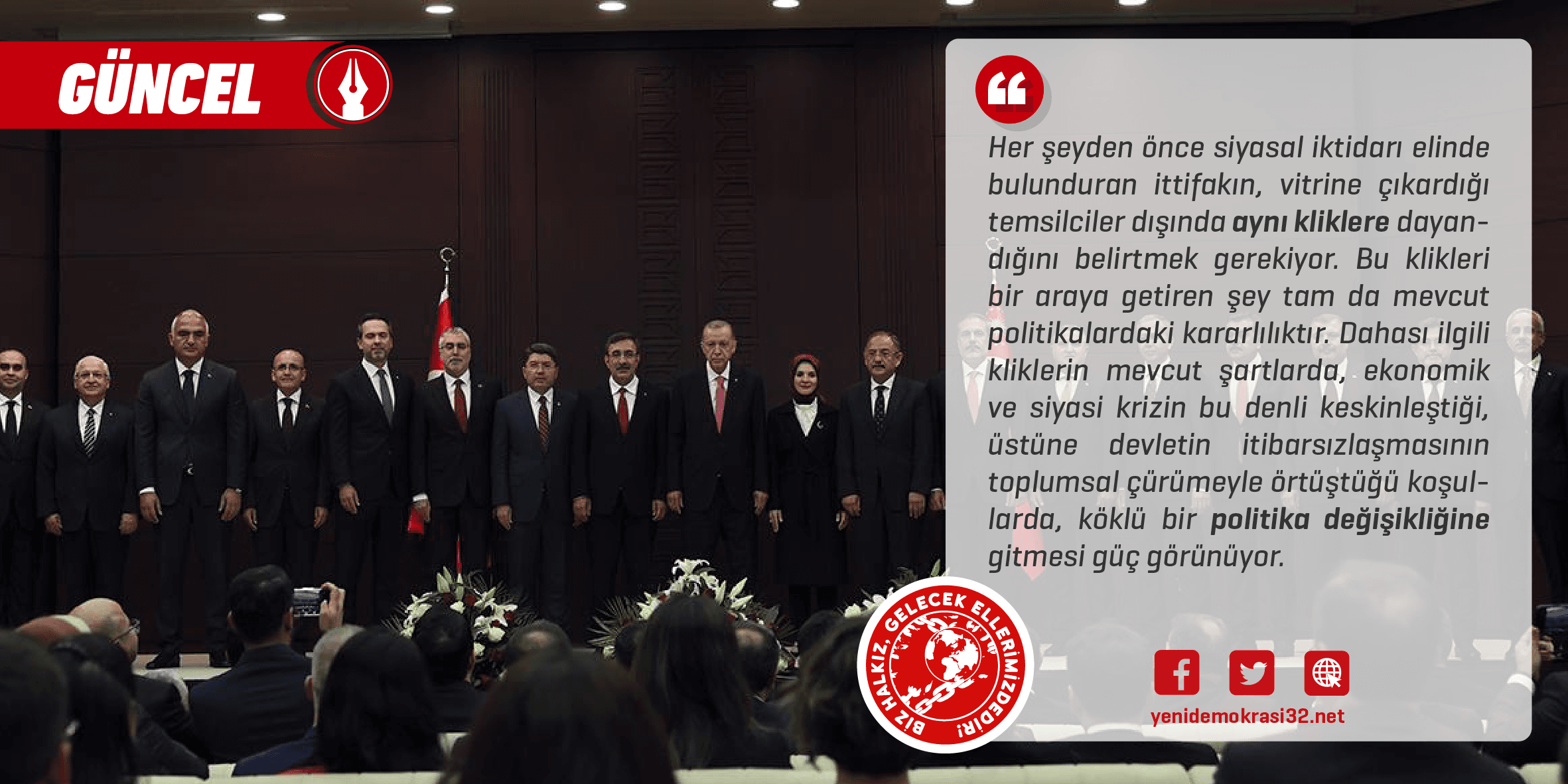 Kabinedeki ilgili değişikliklerin yeni dönem politikalarını nasıl etkileyeceği üzerine çokça yazıldı. Her şeyden önce siyasal iktidarı elinde bulunduran ittifakın, vitrine çıkardığı temsilciler dışında aynı kliklere dayandığını belirtmek gerekiyor. Bu klikleri bir araya getiren şey tam da mevcut politikalardaki kararlılıktır. Dahası ilgili kliklerin mevcut şartlarda, ekonomik ve siyasi krizin bu denli keskinleştiği, üstüne devletin itibarsızlaşmasının toplumsal çürümeyle örtüştüğü koşullarda, köklü bir politika değişikliğine gitmesi güç görünüyor. Yeni kabinenin hiçbir anlam ifade etmediğini ya da hiçbir değişiklik yaşanmayacağını iddia etmiyoruz elbette.