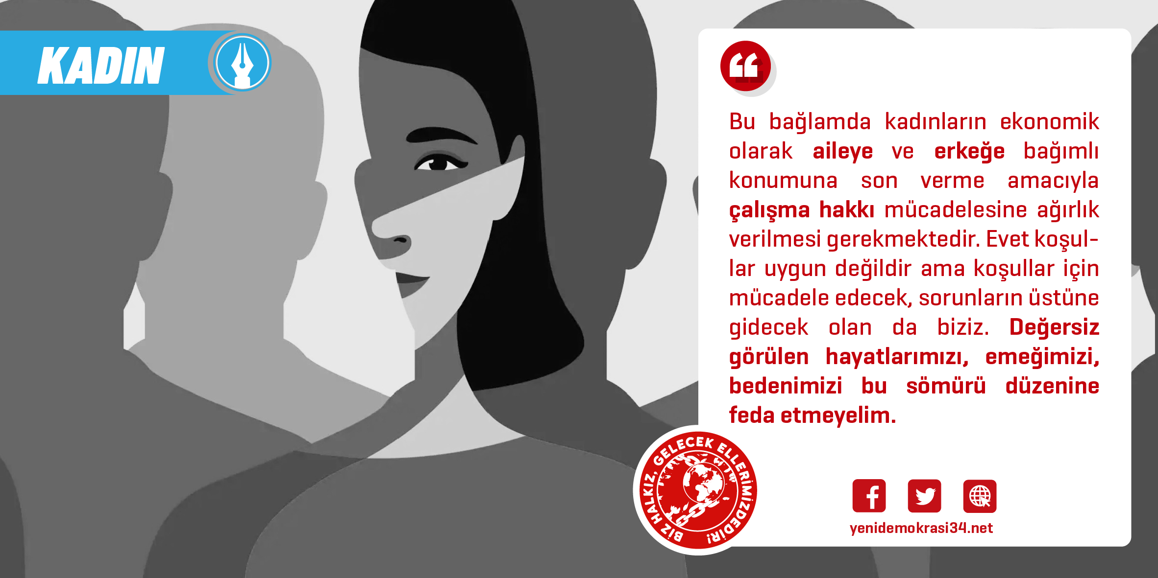 Biz ise kadınların üretim alanlarına çekilmesi mücadelesini temel alan bir rotayı benimsemek görüşündeyiz. Bu bağlamda kadınların ekonomik olarak aileye ve erkeğe bağımlı konumuna son verme amacıyla çalışma hakkı mücadelesine ağırlık verilmesi gerekmektedir. Evet koşullar uygun değildir ama koşullar için mücadele edecek, sorunların üstüne gidecek olan da biziz. Değersiz görülen hayatlarımızı, emeğimizi, bedenimizi bu sömürü düzenine feda etmeyelim.