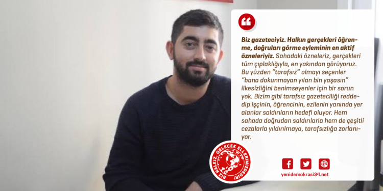 “Biz gazeteciyiz. Halkın gerçekleri öğrenme, doğruları görme eyleminin en aktif özneleriyiz. Sahadaki özneleriz, gerçekleri tüm çıplaklığıyla, en yakından görüyoruz. Bu yüzden ‘tarafsız’ olmayı seçenler ‘bana dokunmayan yılan bin yaşasın’ ilkesizliğini benimseyenler için bir sorun yok. Bizim gibi tarafsız gazeteciliği reddedip işçinin, öğrencinin, ezilenin yanında yer alanlar saldırıların hedefi oluyor. Hem sahada doğrudan saldırılarla hem de çeşitli cezalarla yıldırılmaya, tarafsızlığa zorlanıyor. Şimdi Siyonist İsrail’in vahşi saldırıları altında Gazze halkından taraf olmamak mümkün mü? KYK yurtlarında can veren, açlık sınırında yaşamaya mahkûm edilen, geleceği çalınan halk gençliğinin tarafında olmamak mümkün mü? Eşi, sevgilisi, babası ya da hiç tanımadığı bir erkek tarafından sokakta katledilen, kazanılmış hakları erkek egemen devlet tarafından gasbedilen kadınların tarafında olmamak mümkün mü? Biz, tutsak da olsak gerçekleri görmeye, gerçekleri olanca açıklığıyla halka göstermeye ve taraf olmaya devam edeceğiz.