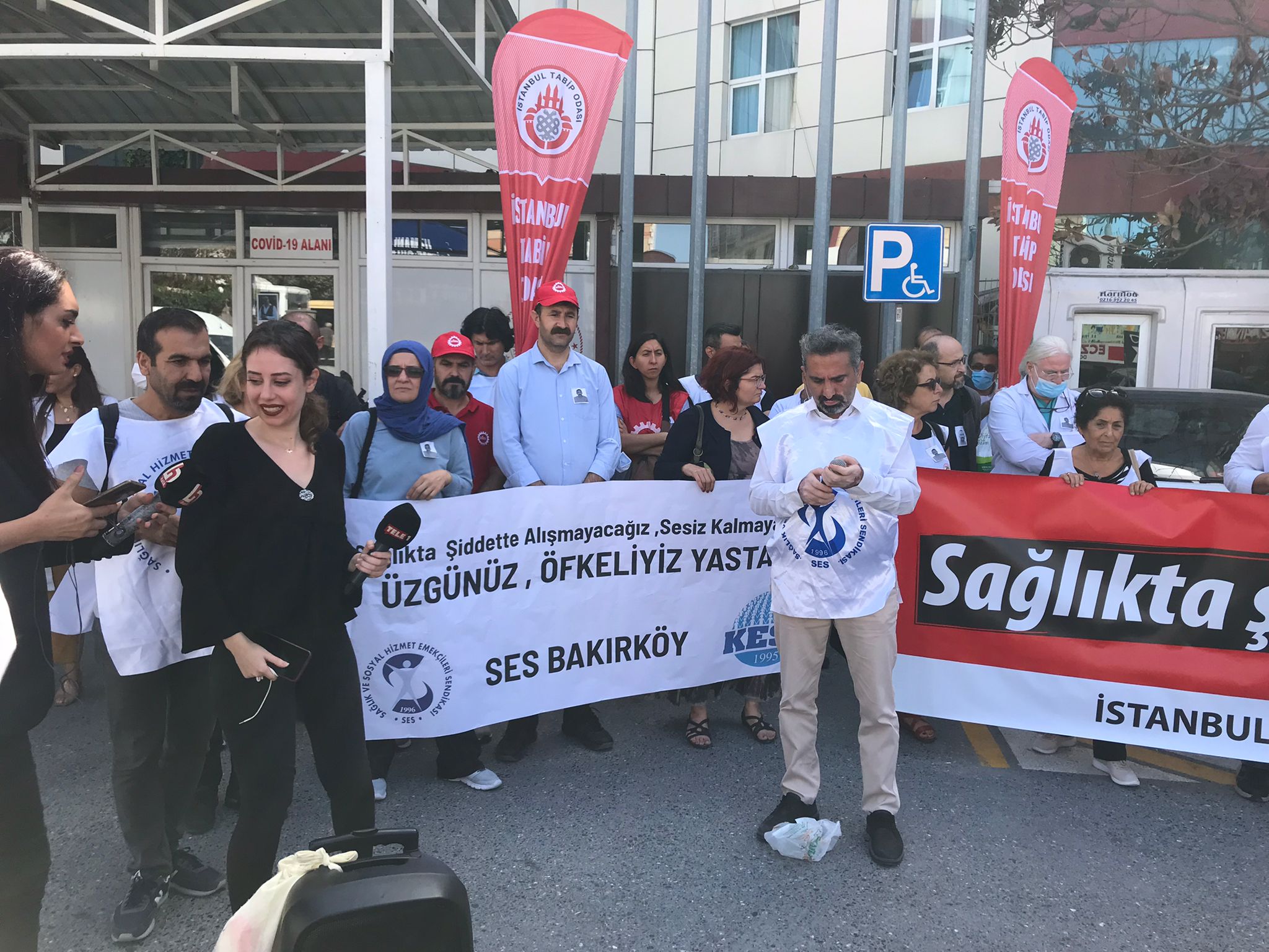 Sağlık emekçileri Esenyurt Necmi Kadıoğlu Devlet Hastanesi’nde saldırı sonucu güvenlik görevlisi Tuğrul Okudan’ın hayatını kaybetmesine tepki göstererek açıklama yaptı.