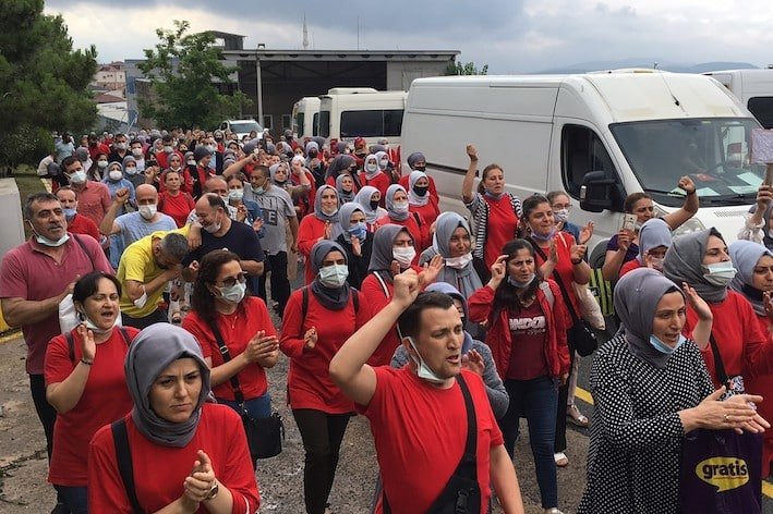 Açıklamanın ardından işçiler fabrikanın Orhanlı-Tuzla yolunu bir süreliğine kapatarak eylemlerini sürdürdü. Çevreden geçen araçların sürücüleri de kornalarıyla işçilere destek oldu. (Evrensel)