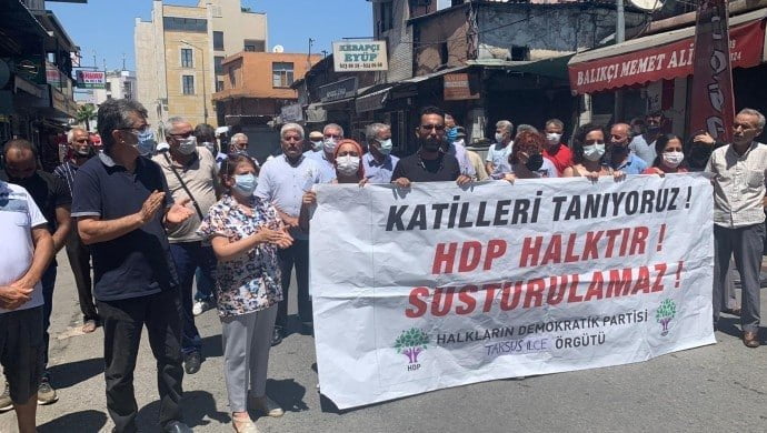 Konya’nın Meram ilçesinde Kürt aileye yönelik gerçekleşen katliam Mersin’in Tarsus ilçesinde kınandı. Halkların Demokratik Partisi (HDP) Tarsus İlçe Örgütü binasında yapılan açıklamaya Milletvekili Fatma Kurtalan, Partizan ve Halkevleri katıldı. Açıklamada “Katilleri tanıyoruz. HDP halktır susturulamaz” pankartı açılarak, sık sık “Faşizme karşı omuz omuza” sloganı atıldı.