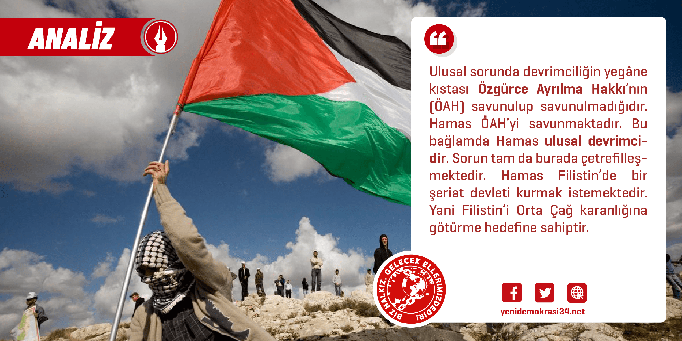 Bu iki kriter eşliğinde Hamas’ı incelediğimizde komünistlerin Hamas’a karşı tavrı da açıklığa kavuşacaktır. Ulusal sorunda devrimciliğin yegâne kıstası Özgürce Ayrılma Hakkı’nın (ÖAH) savunulup savunulmadığıdır. Hamas ÖAH’yi savunmaktadır. Bu bağlamda Hamas ulusal devrimcidir. Sorun tam da burada çetrefilleşmektedir. Hamas Filistin’de bir şeriat devleti kurmak istemektedir. Yani Filistin’i Orta Çağ karanlığına götürme hedefine sahiptir.