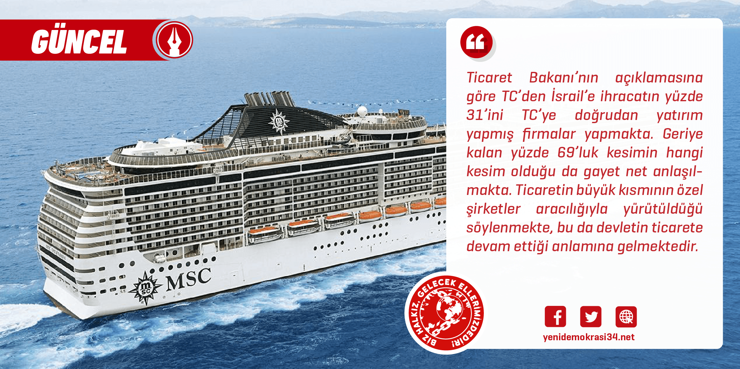 Gazeteci Metin Cihan yaptığı paylaşımda, TC’den İsrail’e giden gemileri ve mal sevkiyatlarını ifşa etti. Buna göre İsrail’e TC’den Burak Erdoğan ve Mecit Mert Çetinkaya ortaklığıyla gemi yollandı. Bunun hemen ardından Erdoğan, gazeteci Metin Cihan hakkında suç duyurusunda bulundu. Gazetecinin sevkiyatlarla ilgili paylaşımlarının silinmesine hükmedildi. Haberlerin silinmesiyle gerçeklerin de ortadan kalkacağı sanıldı! Ancak birçok uygulama üzerinden İsrail’e giden gemilerin hepsi kolayca görülebiliyordu. Buna da hemen bir çözüm ürettiler. İsrail limanlara, gemi bilgilerini gizleme talimatı verdi. Elbette bunun TC için atılan bir adım olduğunu söyleyemeyiz. İsrail, bu adımı kendi güvenliğini sağlamak için atmıştır. Ancak İsrail’le ticarete devam eden Filistin “destekçisi” devletler bundan yararlanacaktır. Böylelikle ticari ilişkileri ifşa edilemeyecek, daha kolay Filistin savunuculuğu yapabileceklerdir.