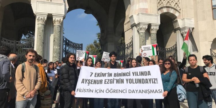 FÖD, İstanbul Üniversitesinde yürüyüş düzenleyerek 7 Ekim’in yıl dönümünde basın açıklaması yaptı. Yürüyüş öncesi ajitasyonlarla yürüyen öğrenciler, İktisat Fakültesi Kütüphanesi önüne yürüdü. Sloganlarla kütüphane önüne gelen öğrenciler, Batı Şeria’da Siyonist İsrail tarafından katledilen Ayşenur Ezgi Eygi’nin adını kütüphaneye verdi. Öğrenciler adına yapılan konuşmada, “Enternasyonal mücadeleci Ayşenur Ezgi Eygi’nin adını verdik. Bu kütüphane İstanbul Üniversitesi öğrencilerinin Filistin halkıyla dayanışma noktasıdır. Üniversitelerimizde hamaset istemiyoruz. Siyonistlerle, emperyalistlerle yaptığınız iş birliğinizi açıklamak zorundasınız.” denildi. Açıklama, “Kampüslerden Gazze’ye Direnişe Bin Selam” sloganıyla son buldu.