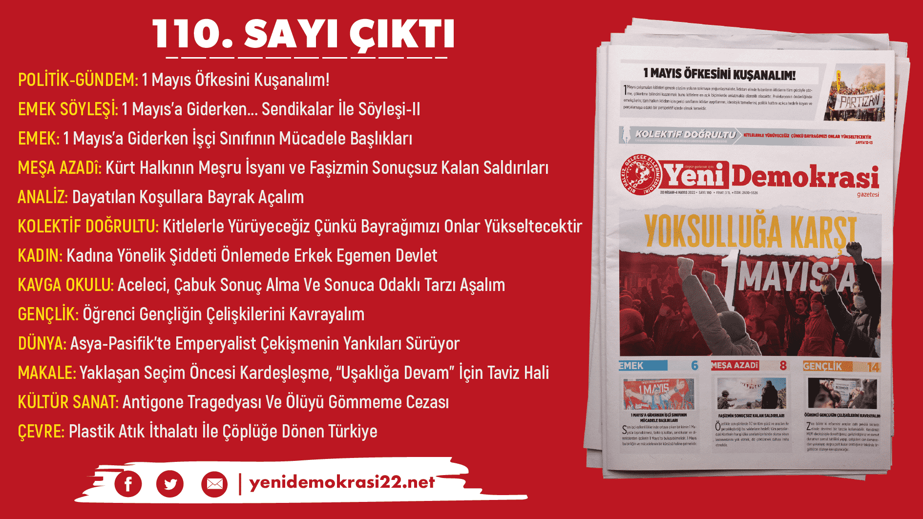 İSTANBUL– Gazetemiz Yeni Demokrasi’nin 110. sayısı “Yoksulluğa Karşı 1 Mayıs’a” manşetiyle çıktı. Gazetemize Umut Yayımcılık büroları, Kadıköy ve Taksim Mephisto Kitabevi’nden ulaşabilirsiniz.