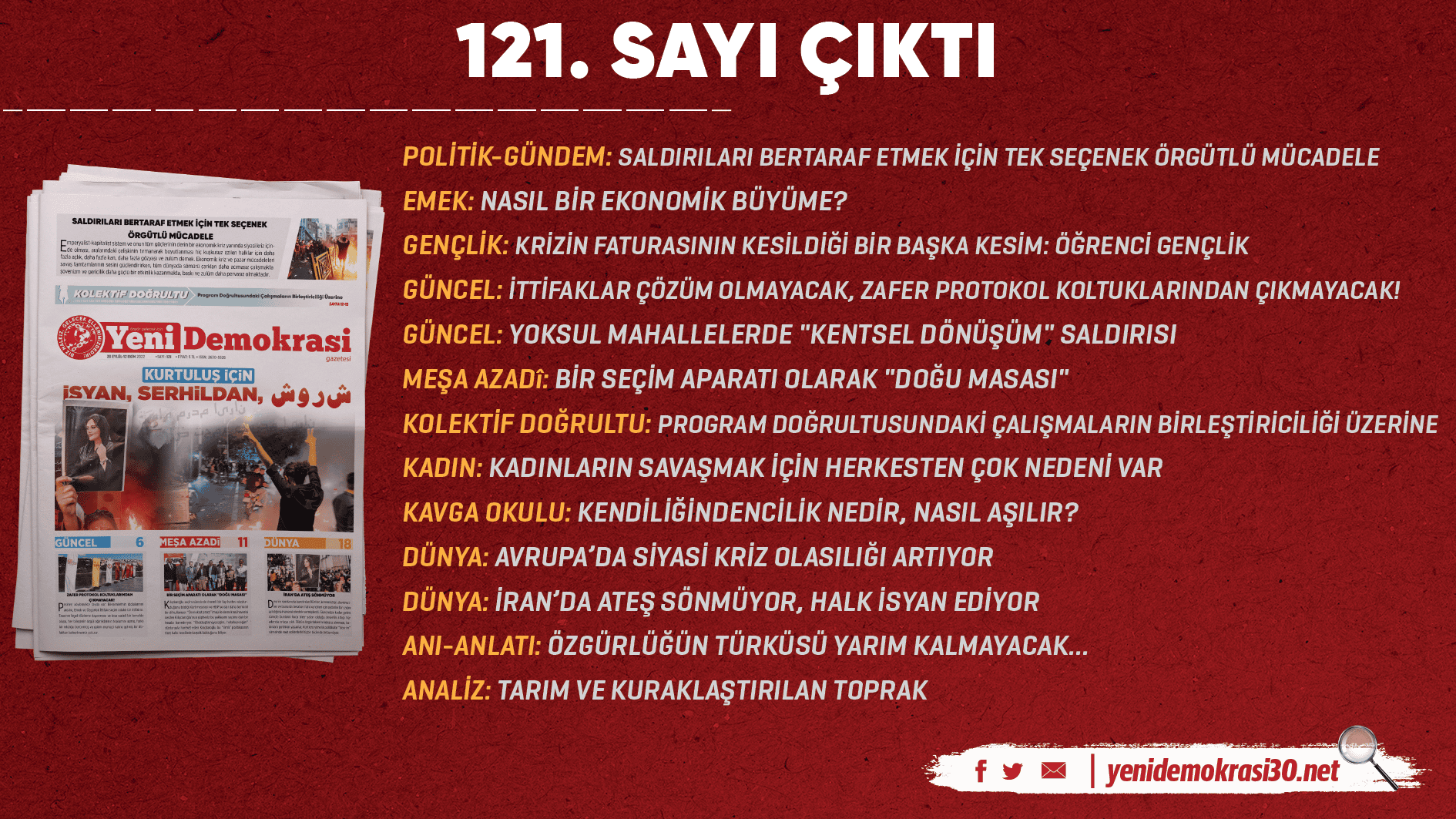 HABER MERKEZİ- Gazetemiz Yeni Demokrasi’nin 121. sayısı “Kurtuluş İçin İsyan, Serhildan, شورش” manşetiyle çıktı. Gazetemize Umut Yayımcılık büroları, Kadıköy ve Taksim Mephisto Kitabevi’nden ulaşabilirsiniz.