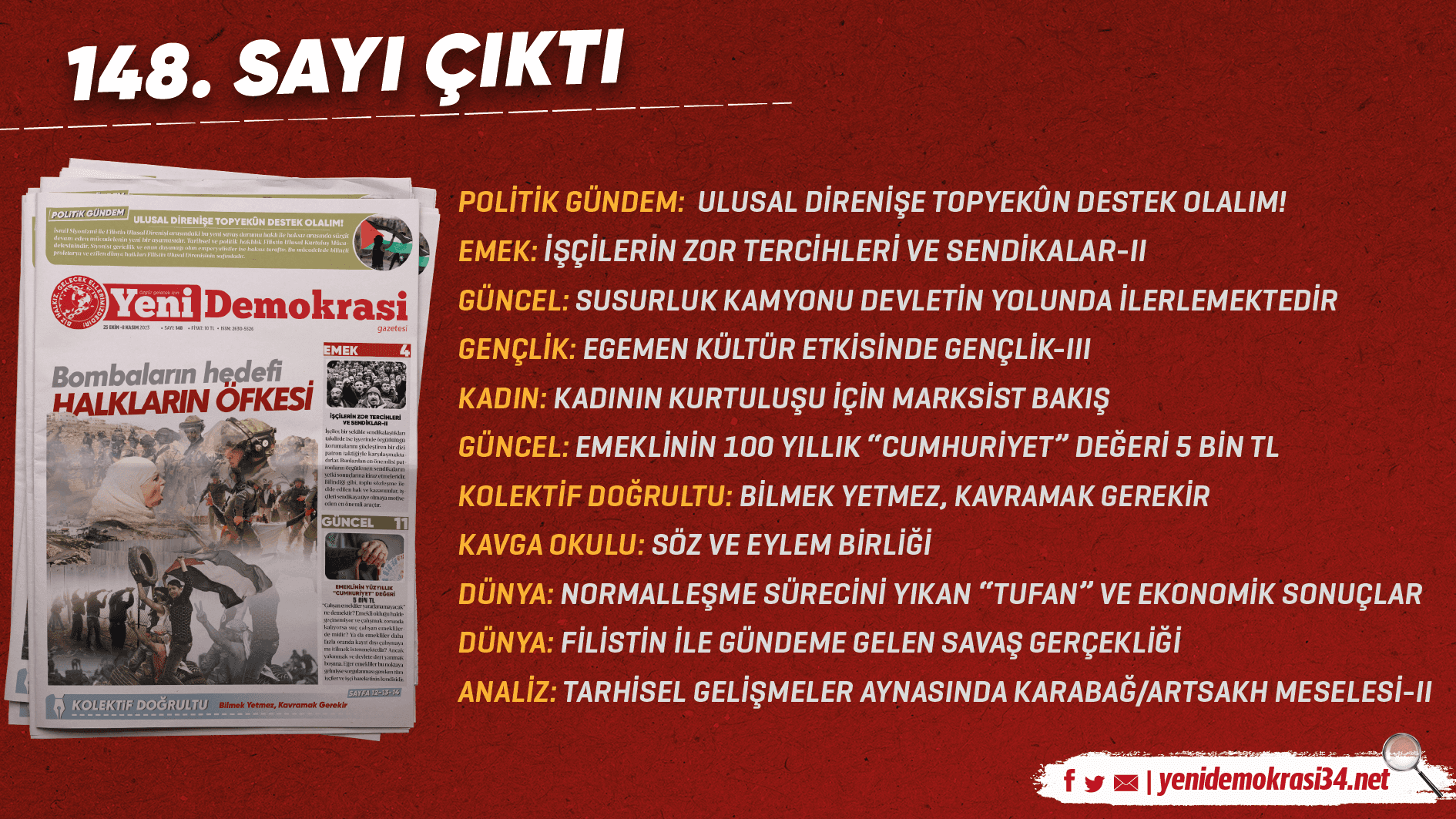 Gazetemiz Yeni Demokrasi’nin 148. sayısı “Bombaların Hedefi Halkların Öfkesi” manşetiyle çıktı. Gazetemize Umut Yayımcılık büroları, Kadıköy ve Taksim Mephisto Kitabevi’nden ulaşabilirsiniz.